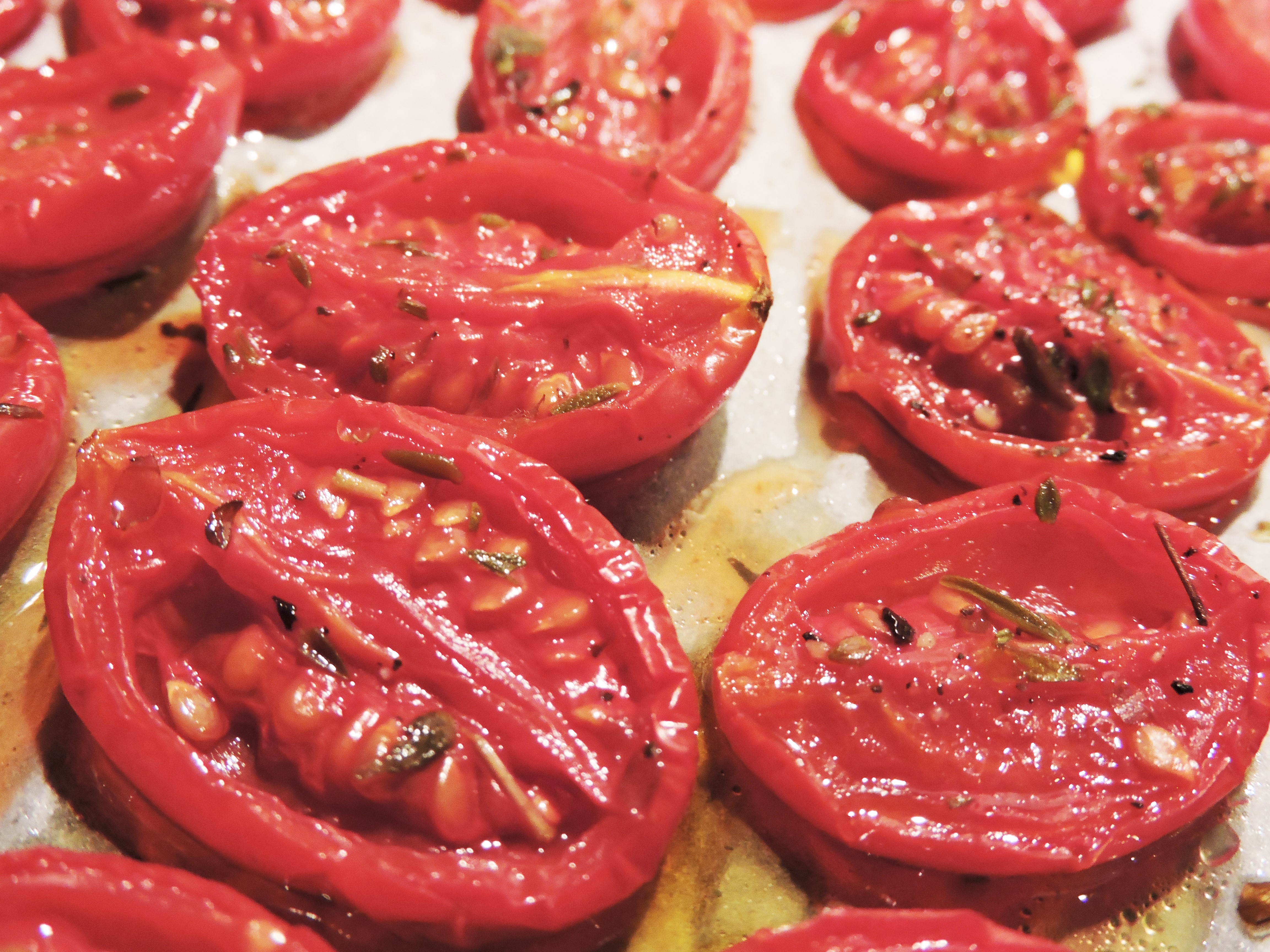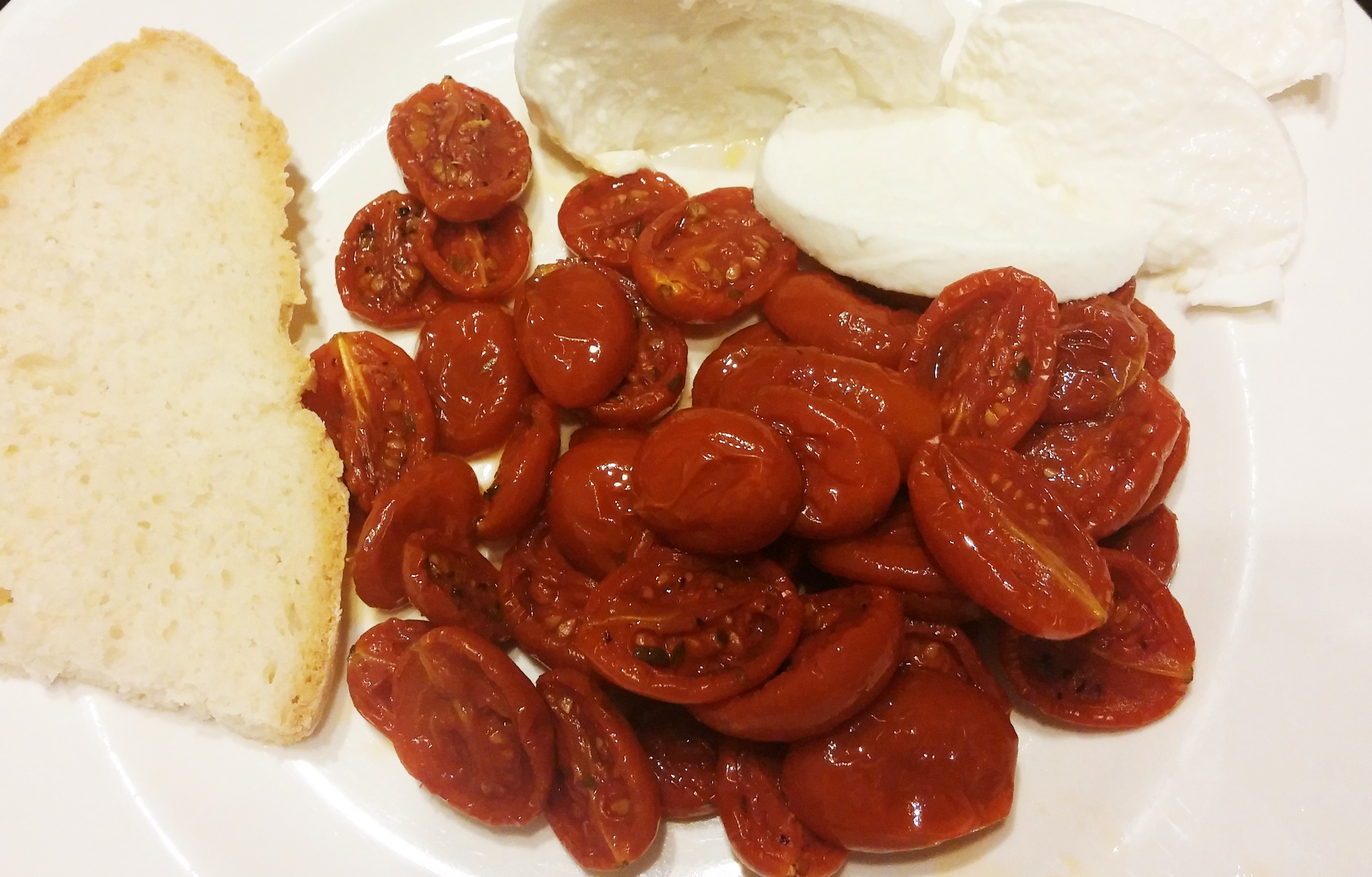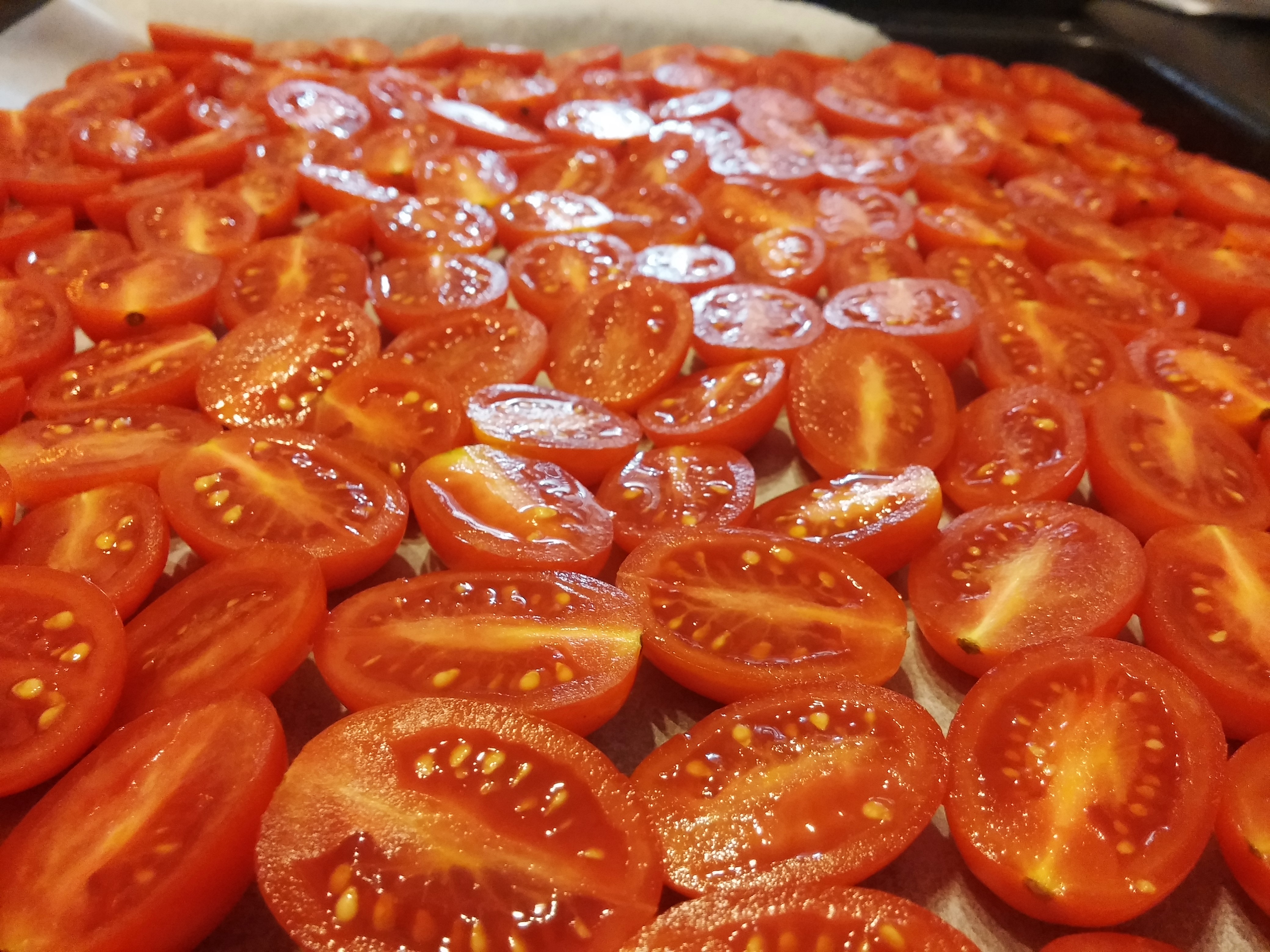 Non so voi, ma io, tra i prodotti estivi che preferisco, al primo posto metto i pomodori in tutte le loro forme. Adoro mangiarli a crudo, conditi con semplice olio e sale, cotti, ripieni, farci la pasta, in insalata. Insomma pomodori sempre e comunque. Questa preparazione però mi mancava e allora eccomi all’opera per fare i pomodorini confit. La scelta è andata sui datterini che a mio avviso si prestano, con quel sapore più pieno e rotondo (anche se tondi non sono!) ad essere consumati senza troppe alterazioni. Tra gli odori da usare per cospargere i pomodori, difatti, io mi limito all’uso dei basilari: sale, pepe e origano. Prima di partire con il procedimento però vi voglio raccontare qualcosa sulla cottura che andremo a fare la confit. Il termine deriva dal francese confire che significa candire, mettere sott’aceto. E’ una tecnica di conservazione del cibo tipica del sud-ovest della Francia. Per confit in Francia si intendevano tutte le preparazioni di alimenti che subivano un’elaborazione lenta e non violenta. Ancora oggi può essere usato per tutti i cibi, frutta o verdura, cotte a lungo con zucchero e aceto. Si parla di cottura e conservazione confit anche per le carni, in particolar modo oche e anatre, che vengono cotte nel proprio grasso e mantenute in vaso. Vi invito a sbirciare questa ricetta del confit d’anatra. Passiamo allora alla nostra preparazione. Diciamo che dare delle dosi è davvero difficile sia per la quantità di pomodorini che delle spezie. Per regolarvi vi dirò che nel vaso di vetro per conserve alimentari da 500 gr possono entrarci circa 800 gr di pomodorini. Quindi abbiamo bisogno di: