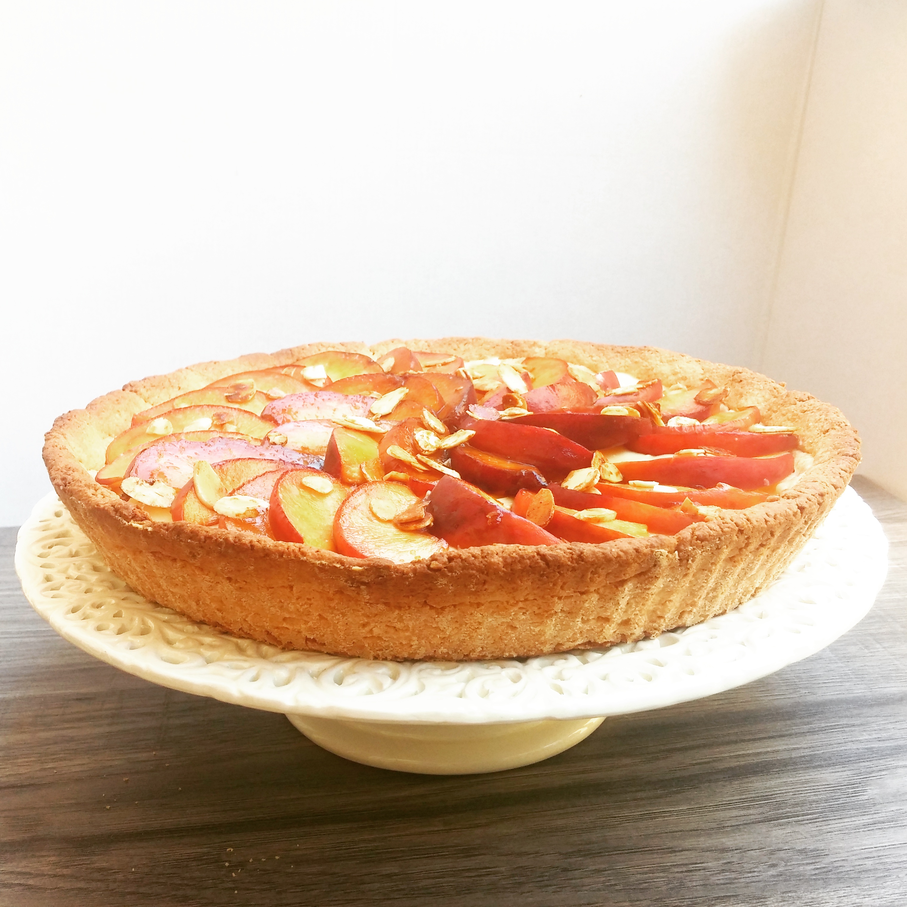 Ed eccoci arrivati al tanto bramato week-end! Stanca dalla settimana ma gasata per il tempo libero che avrò. Questo si traduce in follie in cucine!!! Visto che è sabato sera ho pensato al dolce della domenica, un dolce semplice ma con qualche variazione che lo rende più glam! La mia crostata crema, pesche e mandorle è un vero successo! E’ il mio biglietto da visita alle cene tra amici! La frolla profuma di esotico, la crema pasticcera ci riporta alle tradizioni e le pesche (le ultime della stagione ormai) si “flambeggiano ” per accogliere il croccante delle mandorle! Vi piace l’idea? Allora ecco di cosa abbiamo bisogno per preparare questa squisita Crostata crema pesche e mandorle: