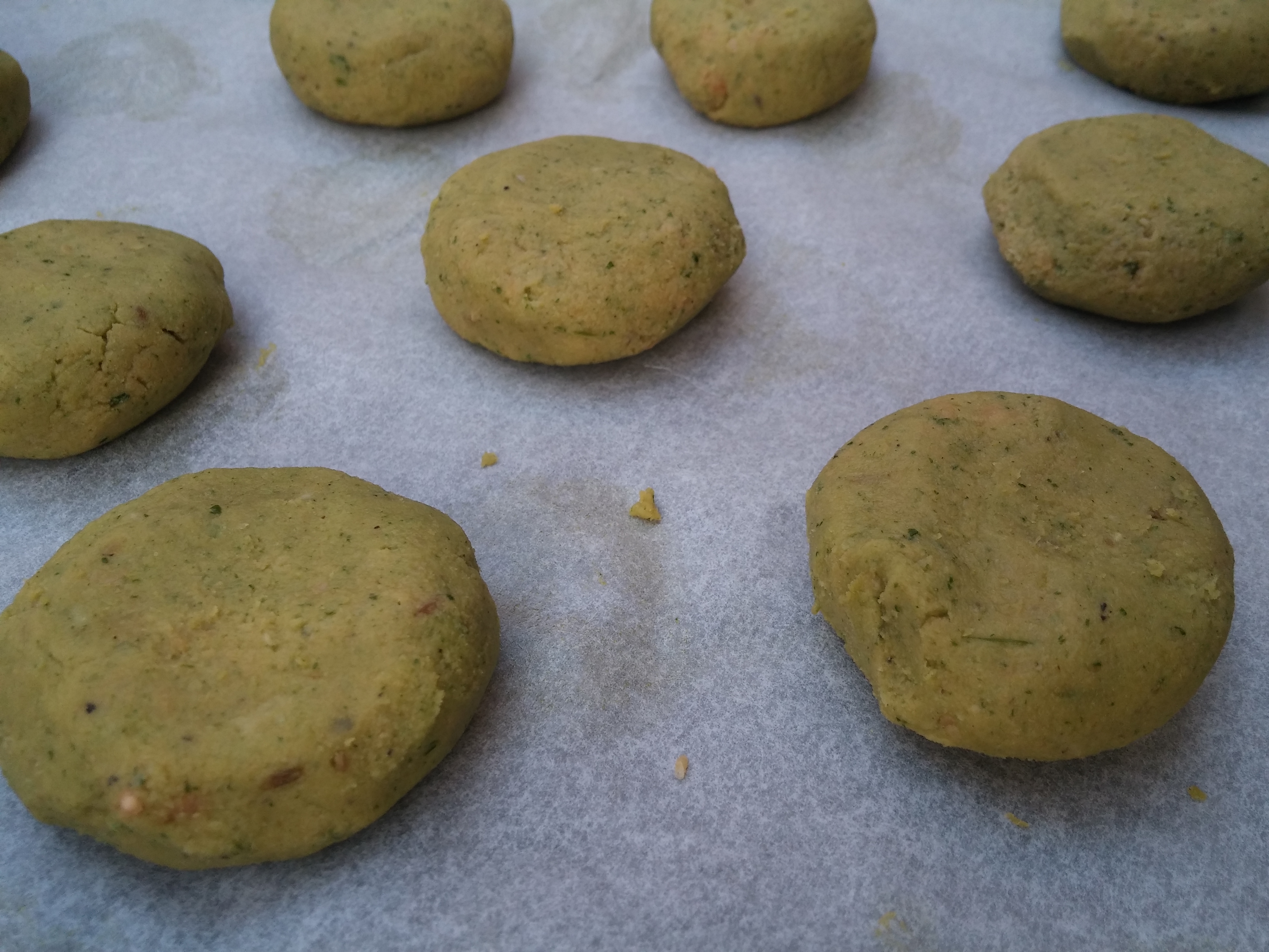 Riprendiamo dal frigo l’impasto dei falafel e ricaviamo, con le mani delle palline di grandezza simile che poi andremo a schiacciare a formare dei piccoli dischi. Adesso, i veri falafel andrebbero fritti, io ho preferito una cottura più light e quindi li ho cotti in forno a 180° per circa 12 minuti, girandoli a metà cottura.