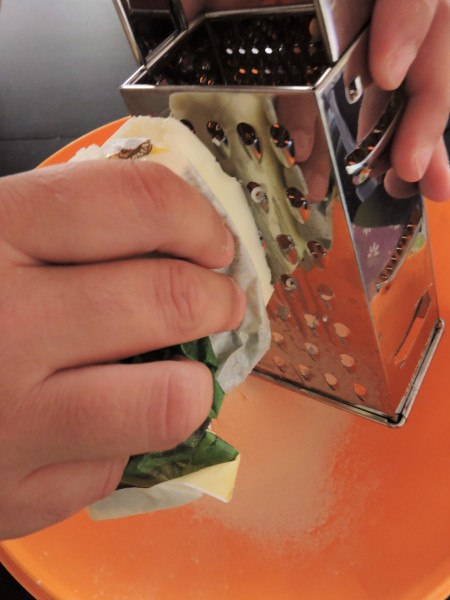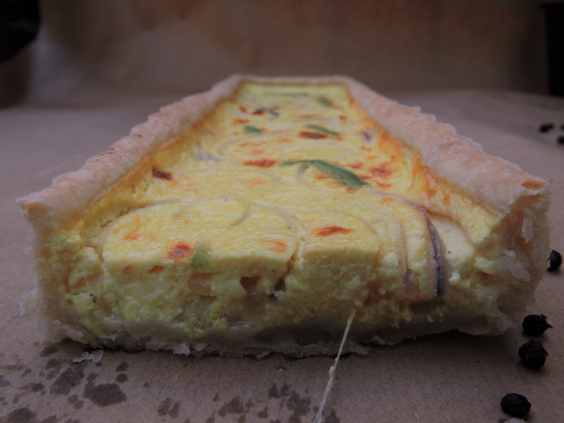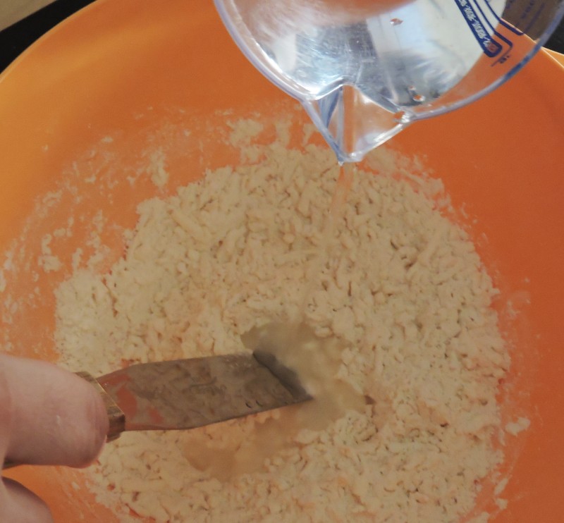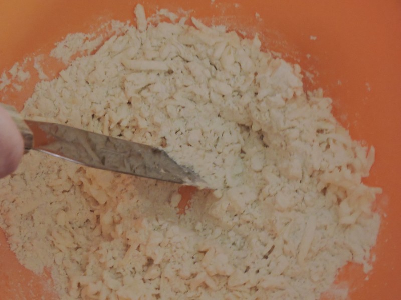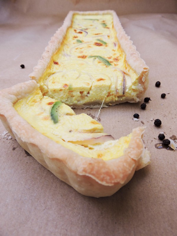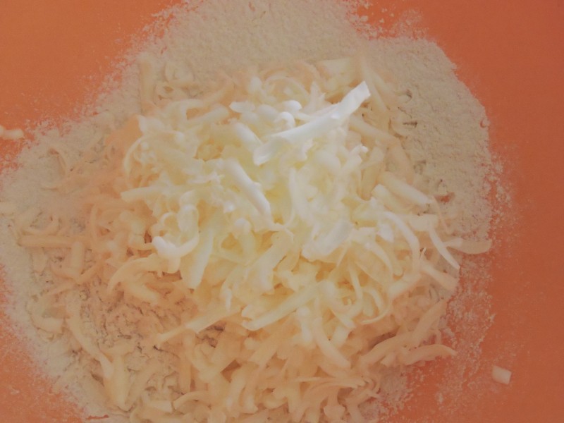 Mettiamo da parte. Affettiamo le cipolle e ricaviamo delle piccole strisce dalla fetta di avocado. Pronto il ripieno occupiamoci della base. In una ciotola capiente setacciamo la farina. Riprendiamo dal congelatore il burro, cercando di maneggiarlo il meno possibile e lasciando della carta per tenerlo mentre lo grattugiamo. Possiamo usare una grattugia a fori grandi. Non temete se qualcosa rimane attaccato alla grattugia, lo recupereremo dopo. Quando il burro sarà tutto grattugiato, con una spatola in ferro preleviamo ciò che è rimasto dietro la grattugia e mischiamo, sempre con la spatola, la farina con il burro fino a farli amalgamare. A questo punto iniziamo ad aggiungere l’acqua, pochissima alla volta, NON SCHERZO, pochissima! Continuiamo a mischiare. Quando inizierà a diventare più sodo ed omogeneo lavoriamo rapidamente con le mani a formare una palla che copriremo con pellicola e lasceremo in frigo per almeno 30 minuti.