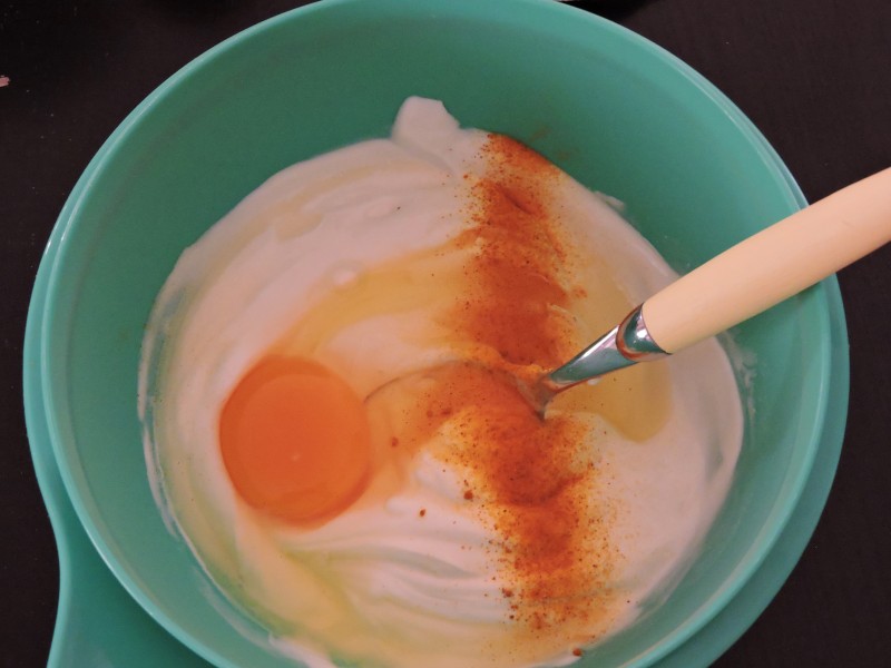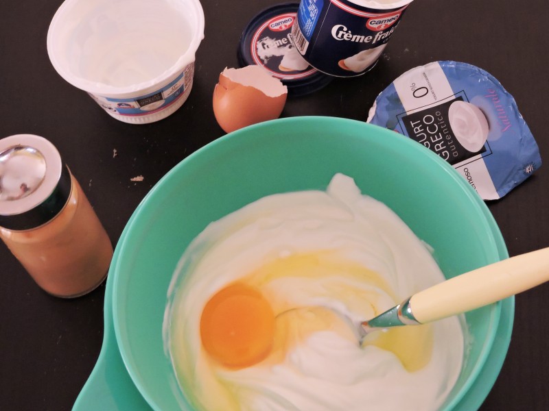 Per prima cosa mettiamo il burro avvolto da pellicola o carta da forno in congelatore per almeno 30 minuti. Questo ci permetterà di grattugiarlo per lavorarlo il meno possibile. Nel frattempo possiamo prepararci il ripieno della nostra torta. In una ciotola uniamo lo yogurt greco e la creme fraiche. Quando saranno ben miscelate uniamo l’uovo intero e gli aromi, un pizzico di sale, una spolverata di pepe e abbondante curcuma e curry. Mischiamo tutto fino ad ottenere un composto omogeneo e leggermente puntinato per via delle spezie.