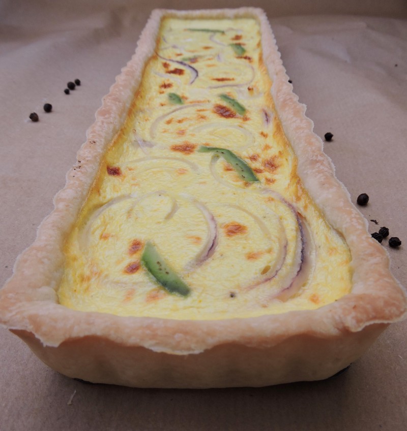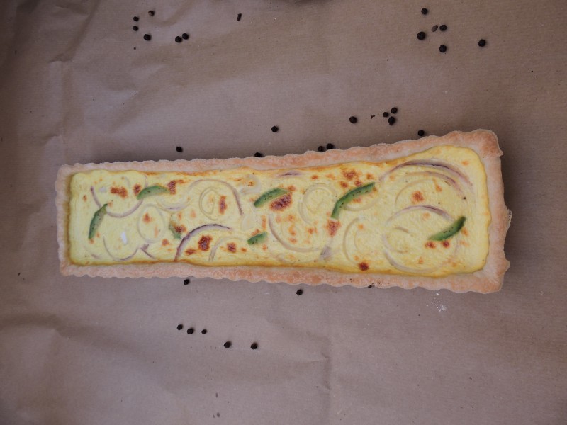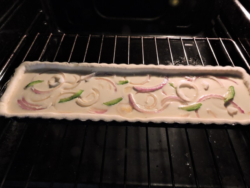 Passato questo tempo, infarinate il piano di lavoro e stendete la pasta. Ricoprite la teglia imburrata eliminando gli eccessi. Versiamo il composto all’interno e adagiamo sopra le fette di cipolla e le fettine di avacado.