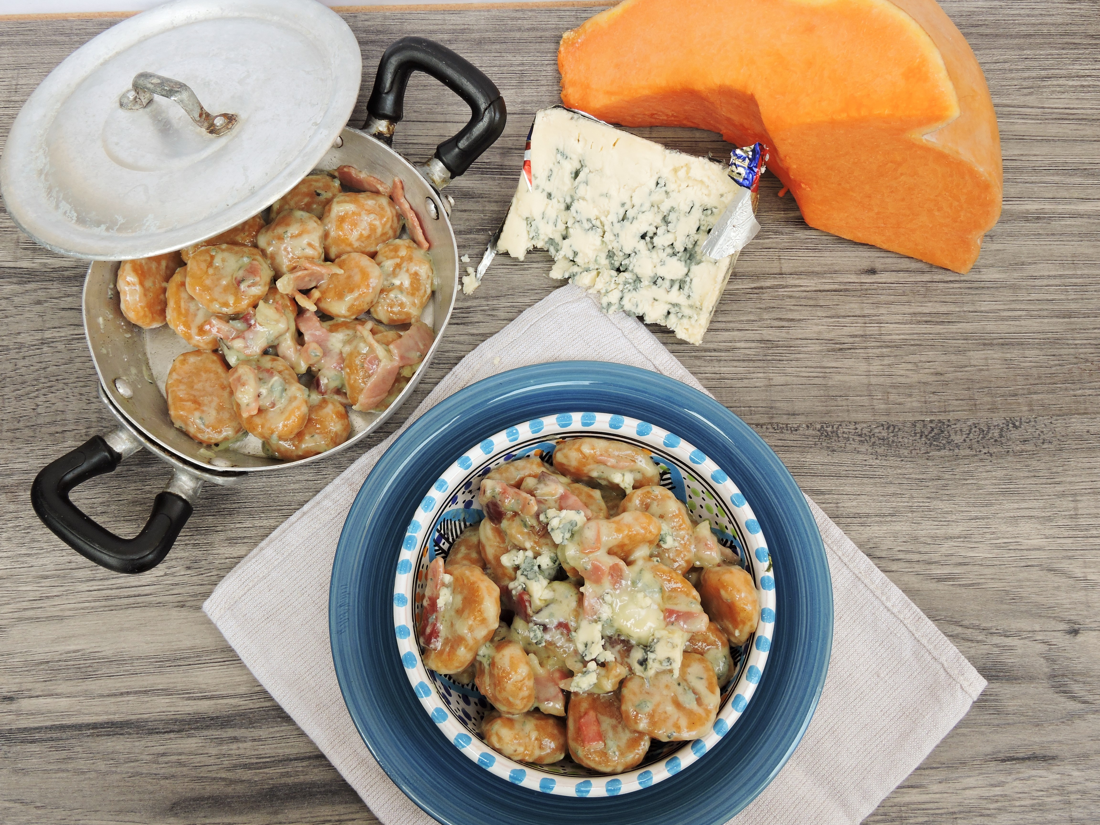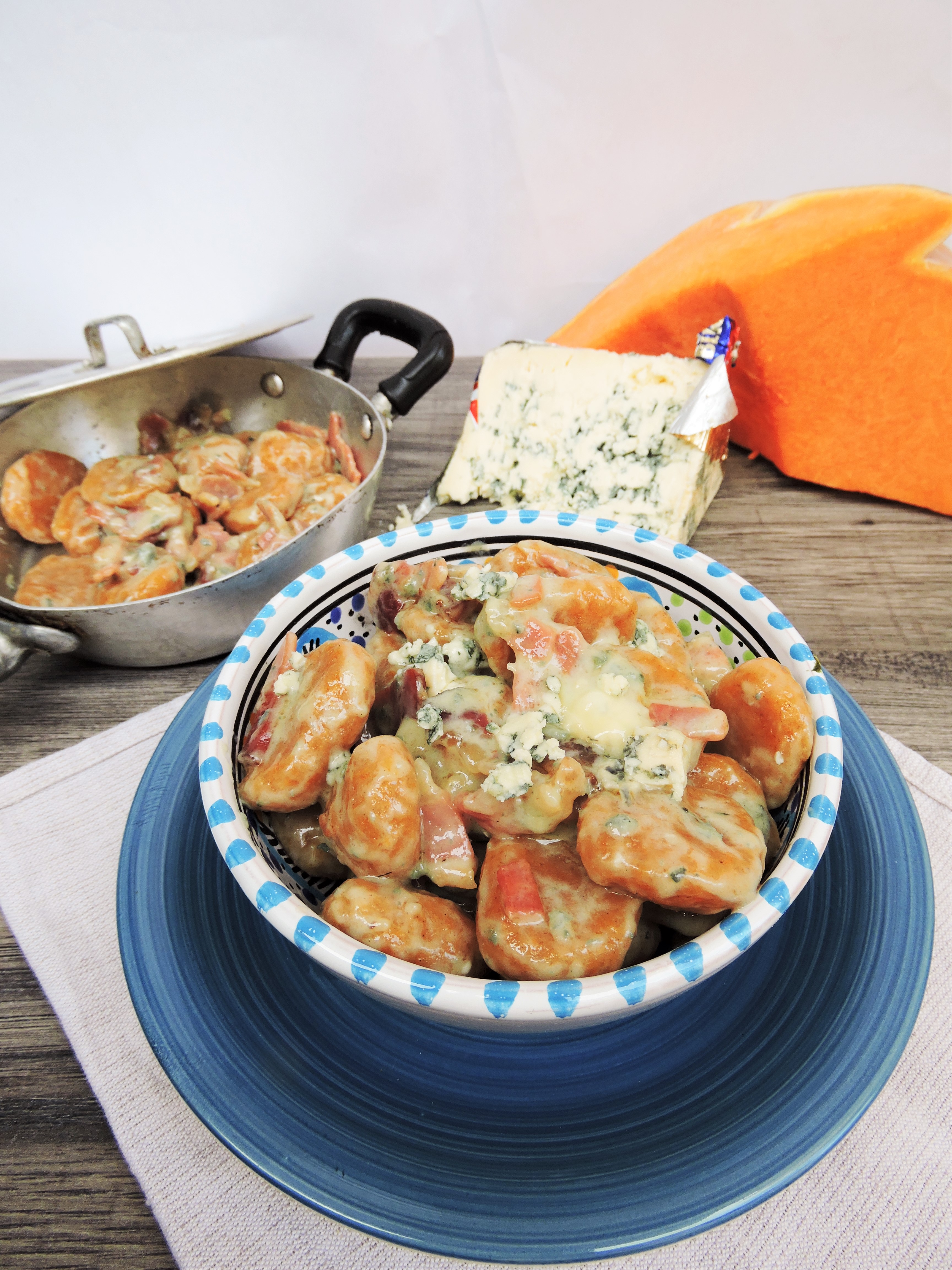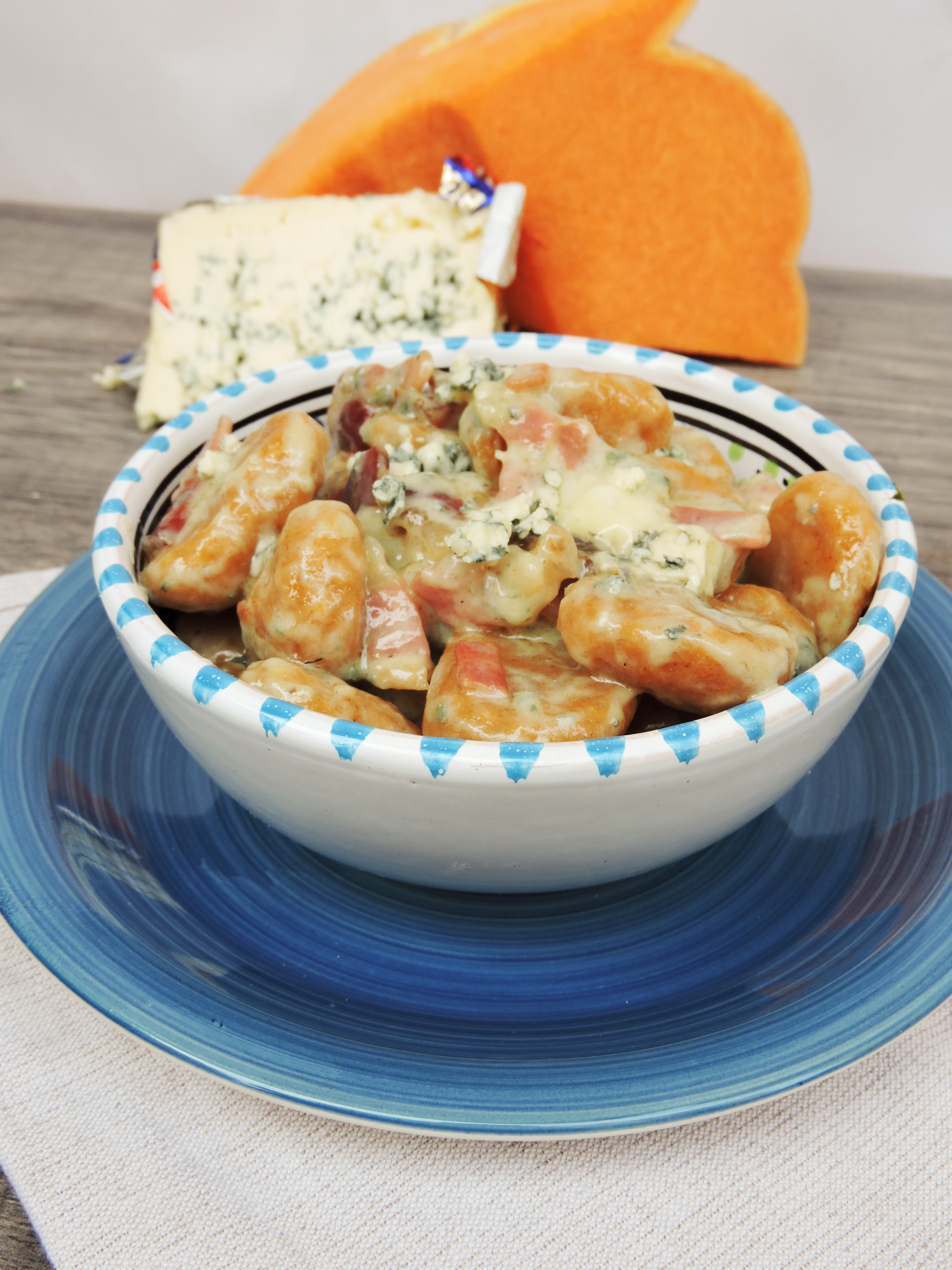Ogni giorno, ogni ricetta che provo è sempre legata ad una caratteristica fondamentale nella mia vita: la curiosità. Definita come il “desiderio di rendersi conto di qualcosa” è il motore che, a mio avviso, muove il mondo. Dall’apprendimento a scuola, alla ricerca scientifica, passando per la cucina, tutto si muove perché siamo curiosi. Per necessità o per pura sete di conoscenza ognuno di noi ha fatto esperienza di questo. Questa giornata , direte, inizia in modo così filosofico, strano, non è da me??? Eppure è proprio da questa curiosità che nasce la ricetta di oggi. Il condimento degli gnocchi di zucca di oggi è fatto con lo Speck igp (e già qui dovremmo aprire un capitolo per raccontare questo stupendo salato) e il Bergader Edepilz. Non fatevi spaventare dal nome, io ci ho messo un bel po’ a capire come dirlo. E’ uno splendido formaggio a pasta molle, leggermente friabile, erborinato bavarese. Girando per il banco dei formaggi mi ha colpito questa forma con questo splendido colore; dopo spiegazione e consiglio della gentile commessa ho deciso di provarlo. Subito mi è balenata la ricetta possibile ed eccomi qui a proporvela. Ecco come nascono le mie prove in cucina, guardo, cerco, chiedo, mi informo e poi si sperimenta. La base della ricetta sono gli gnocchi di zucca , ormai nel mood autunnale, non posso fare a meno di prepararla. Ecco di cosa abbiamo bisogno per 2 persone: