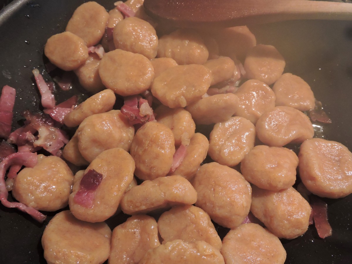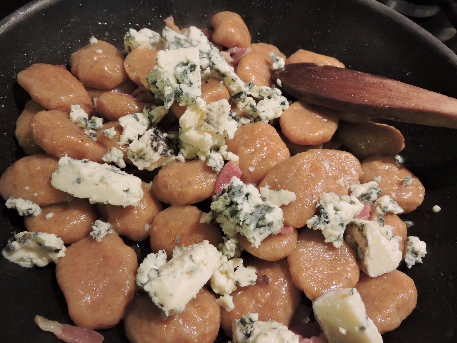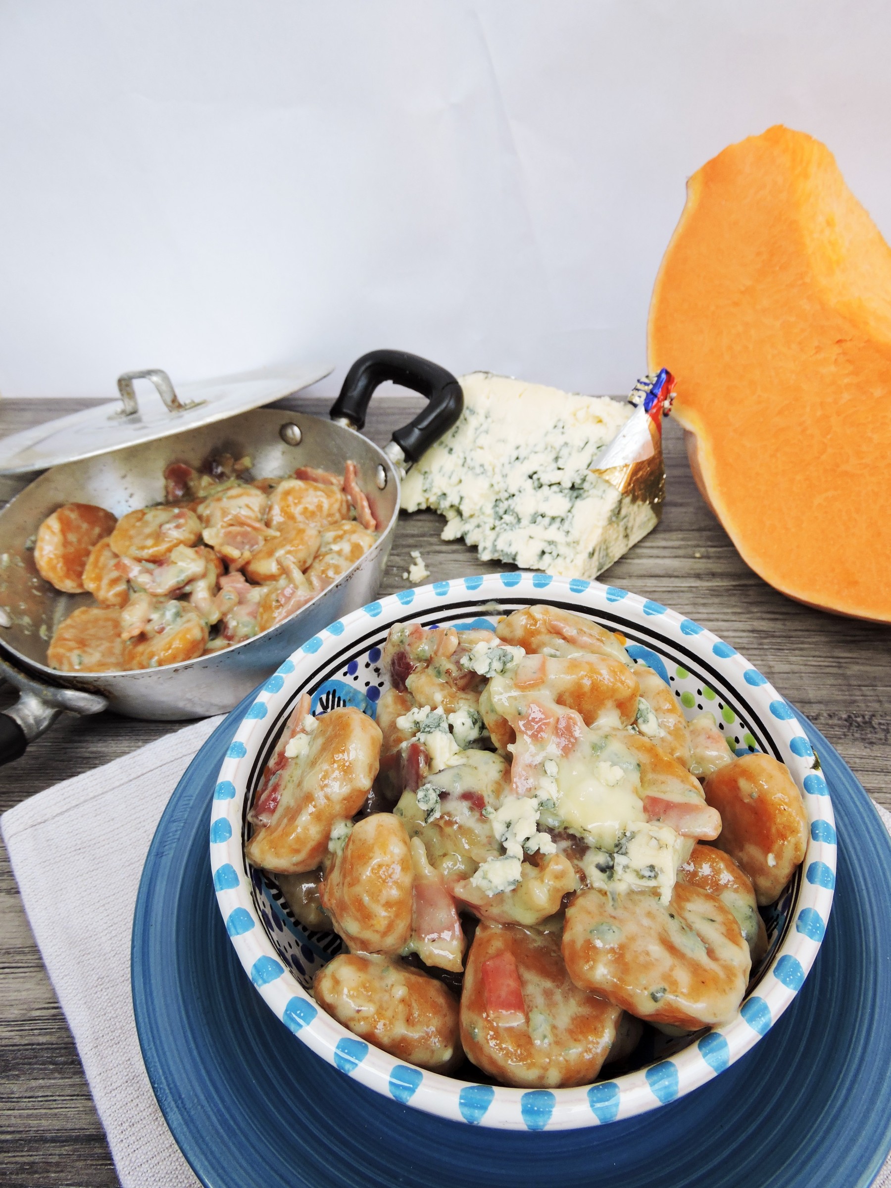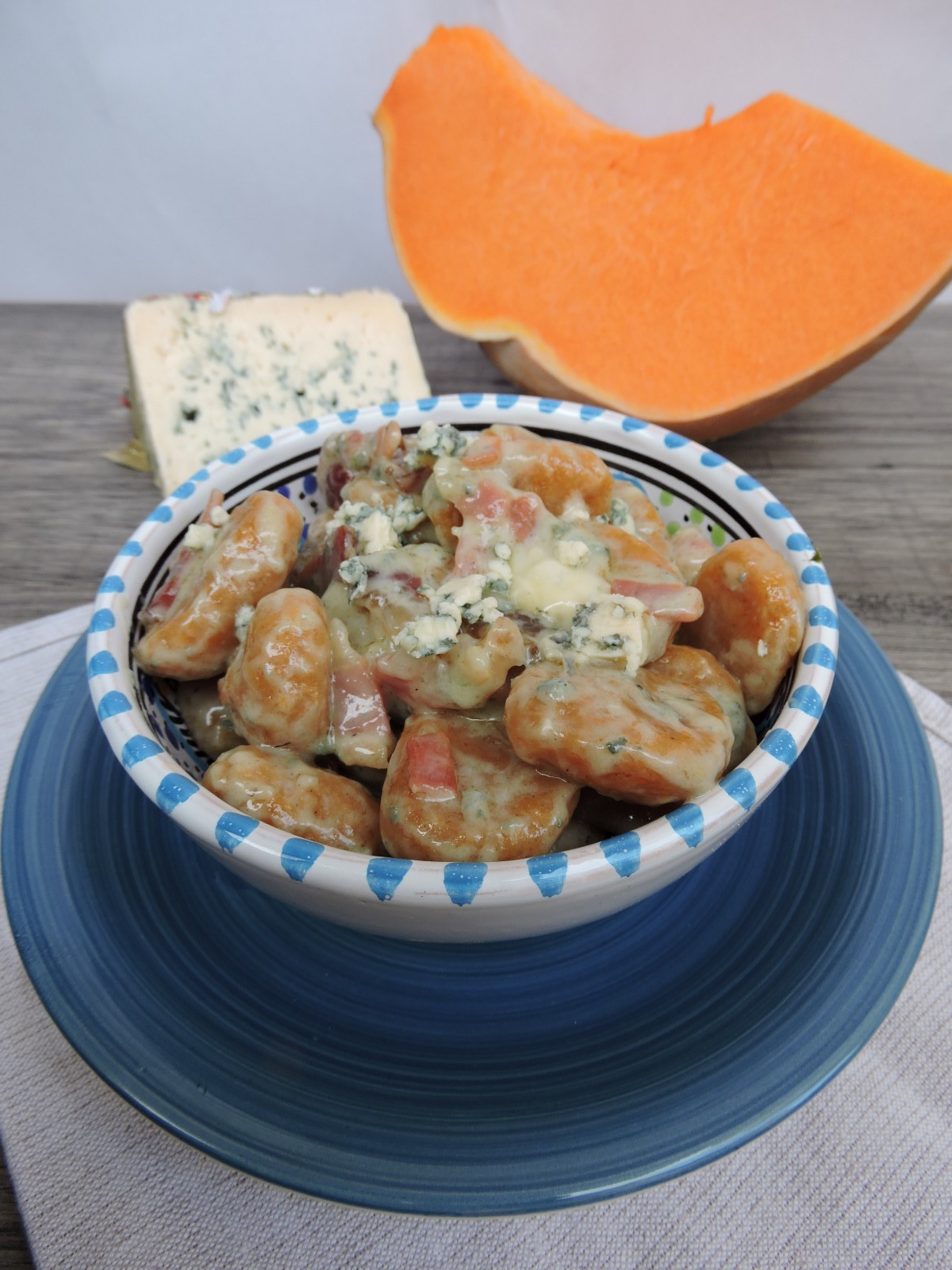 Ogni giorno, ogni ricetta che provo è sempre legata ad una caratteristica fondamentale nella mia vita: la curiosità. Definita come il “desiderio di rendersi conto di qualcosa” è il motore che, a mio avviso, muove il mondo. Dall’apprendimento a scuola, alla ricerca scientifica, passando per la cucina, tutto si muove perché siamo curiosi. Per necessità o per pura sete di conoscenza ognuno di noi ha fatto esperienza di questo. Questa giornata , direte, inizia in modo così filosofico, strano, non è da me??? Eppure è proprio da questa curiosità che nasce la ricetta di oggi. Il condimento degli gnocchi di zucca di oggi è fatto con lo Speck igp (e già qui dovremmo aprire un capitolo per raccontare questo stupendo salato) e il Bergader Edepilz. Non fatevi spaventare dal nome, io ci ho messo un bel po’ a capire come dirlo. E’ uno splendido formaggio a pasta molle, leggermente friabile, erborinato bavarese. Girando per il banco dei formaggi mi ha colpito questa forma con questo splendido colore; dopo spiegazione e consiglio della gentile commessa ho deciso di provarlo. Subito mi è balenata la ricetta possibile ed eccomi qui a proporvela. Ecco come nascono le mie prove in cucina, guardo, cerco, chiedo, mi informo e poi si sperimenta. La base della ricetta sono gli gnocchi di zucca , ormai nel mood autunnale, non posso fare a meno di prepararla. Ecco di cosa abbiamo bisogno per 2 persone: