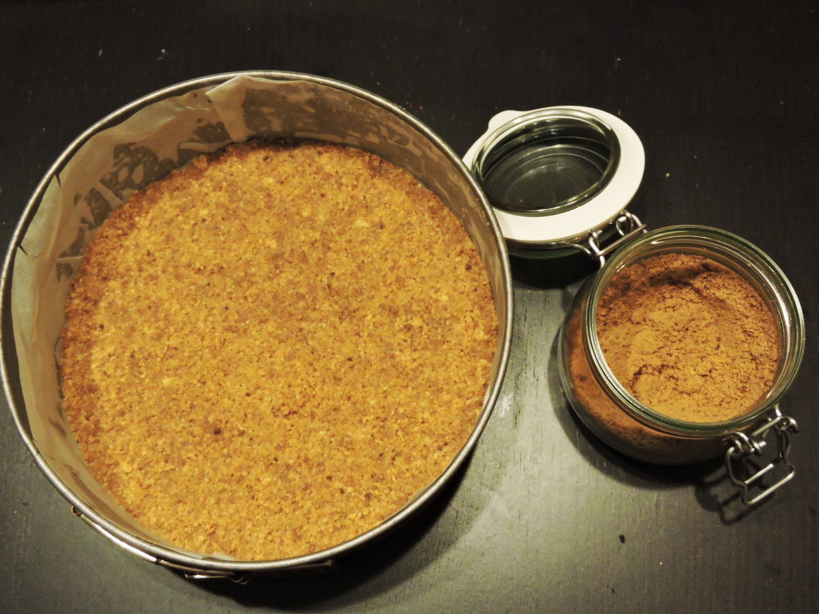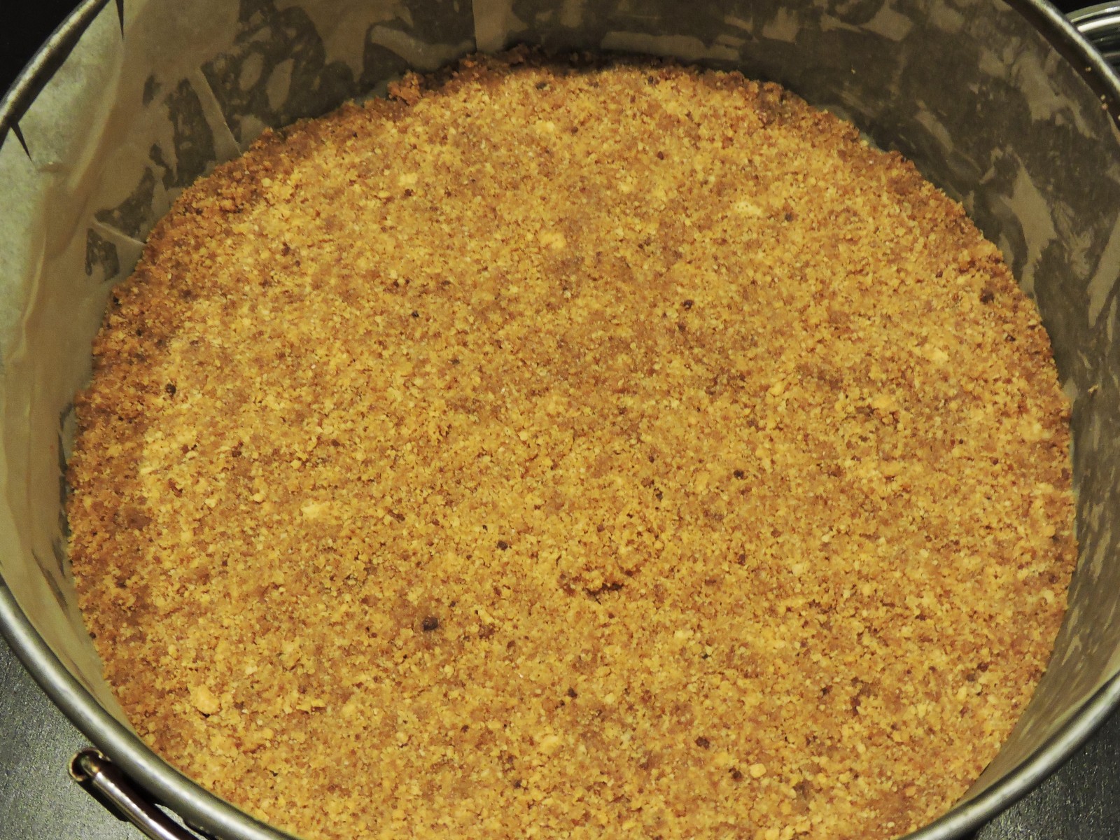 Preparare la base tritando i biscotti nel mixer fino ad ottenere una farina. Aggiungere lo zucchero e il burro fuso. Amalgamare gli ingredienti prima con la forchetta poi con le mani. Foderare una tortiera a cerniera con della carta forno. Con il mix di biscotti e burro ricoprire il fondo facendo pressione per compattare bene il fondo. In una ciotola unire il formaggio cremoso con lo zucchero e frullare insieme. Aggiungere le uova, una alla volta. Infine unire la panna e, con l’aiuto delle fruste montare leggermente il composto. Risulterà piuttosto liquido, non vi preoccupate.