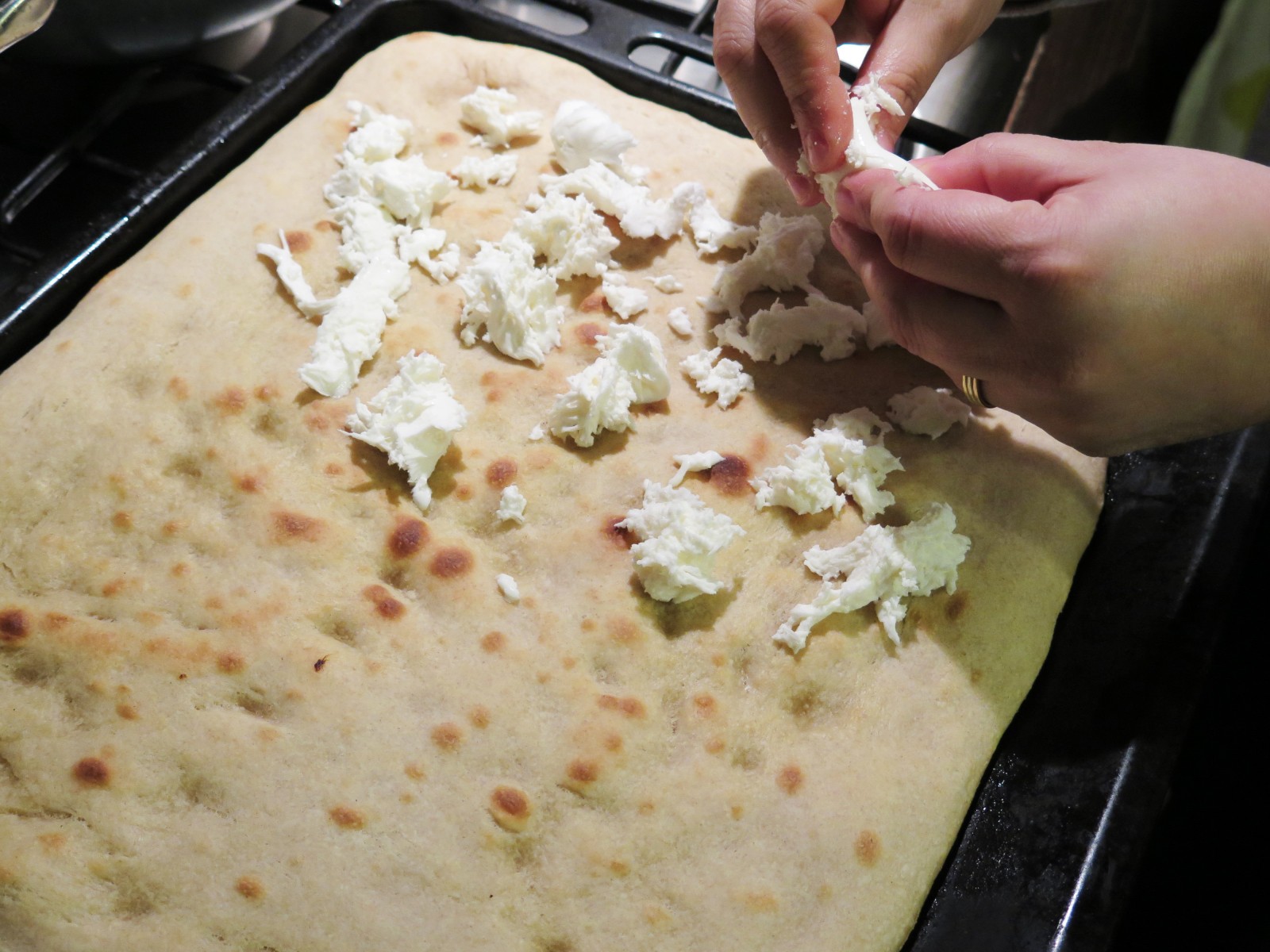 Per prima cosa sciogliamo il lievito madre in 100 gr di acqua e uniamo il malto o miele. In un’altra ciotola uniamo tutta la farina con la restante acqua (250 gr), mescolare grossolanamente (facciamo quella che si dice autolisi) senza impastare ma facendo attenzione affinché tutta la farina sia “bagnata”. Lasciamo entrambe le preparazioni per 1 ora. Alla fine di questo periodo i tempo unire i due impasti e lentamente l’olio. L’impasto risulta abbastanza morbido e sembra difficile da gestire, tranquilli, amalgamate il tutto, unite il sale e lasciate in ciotola per 15 minuti almeno. Dopo questo tempo , riprendete l’impasto e lavoratelo ancora un pochino, cercando di fare delle pieghe in ciotola e lasciare ancora 15 minuti. Dopo di che, mettiamo l’impasto sul piano di lavoro e pirliamo bene. Porre in ciotola a lievitare per circa 8 ore. Finita la lievitazione, sgonfiare l’impasto, ungendovi leggermente le mani e capovolgete sulla leccarda, anche essa leggermente unta. Allargate l’impasto e lasciate lievitare ancora un’ora.