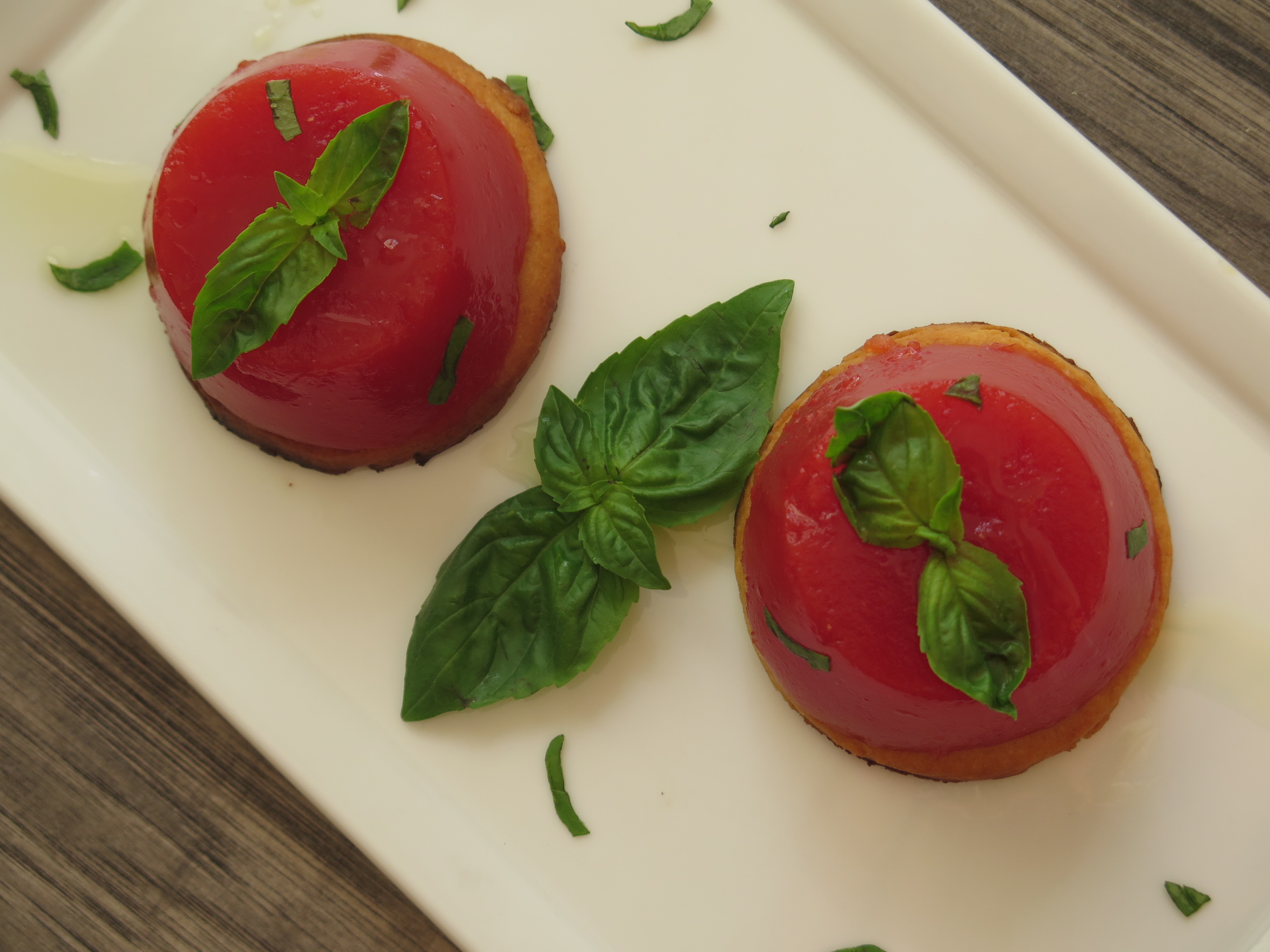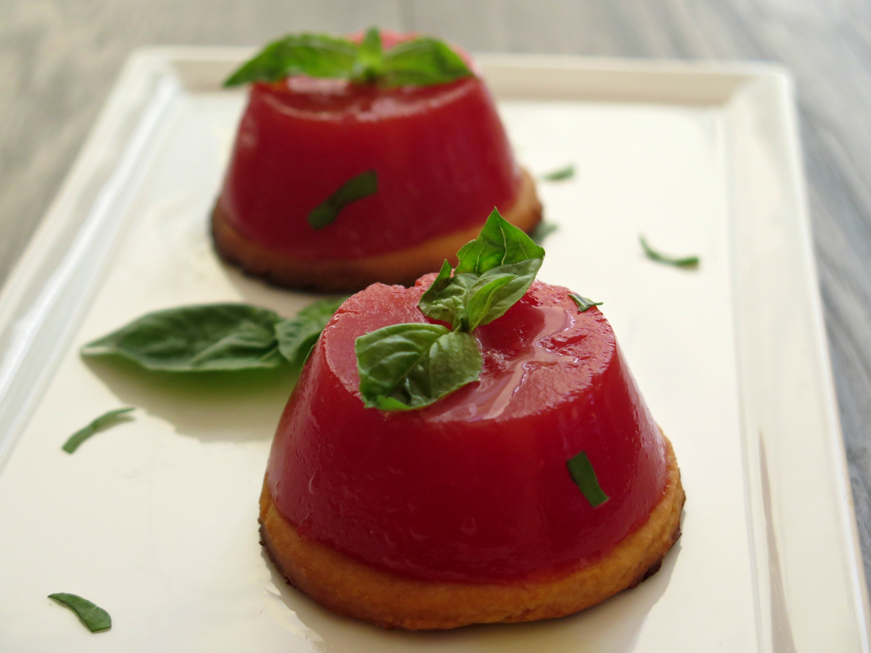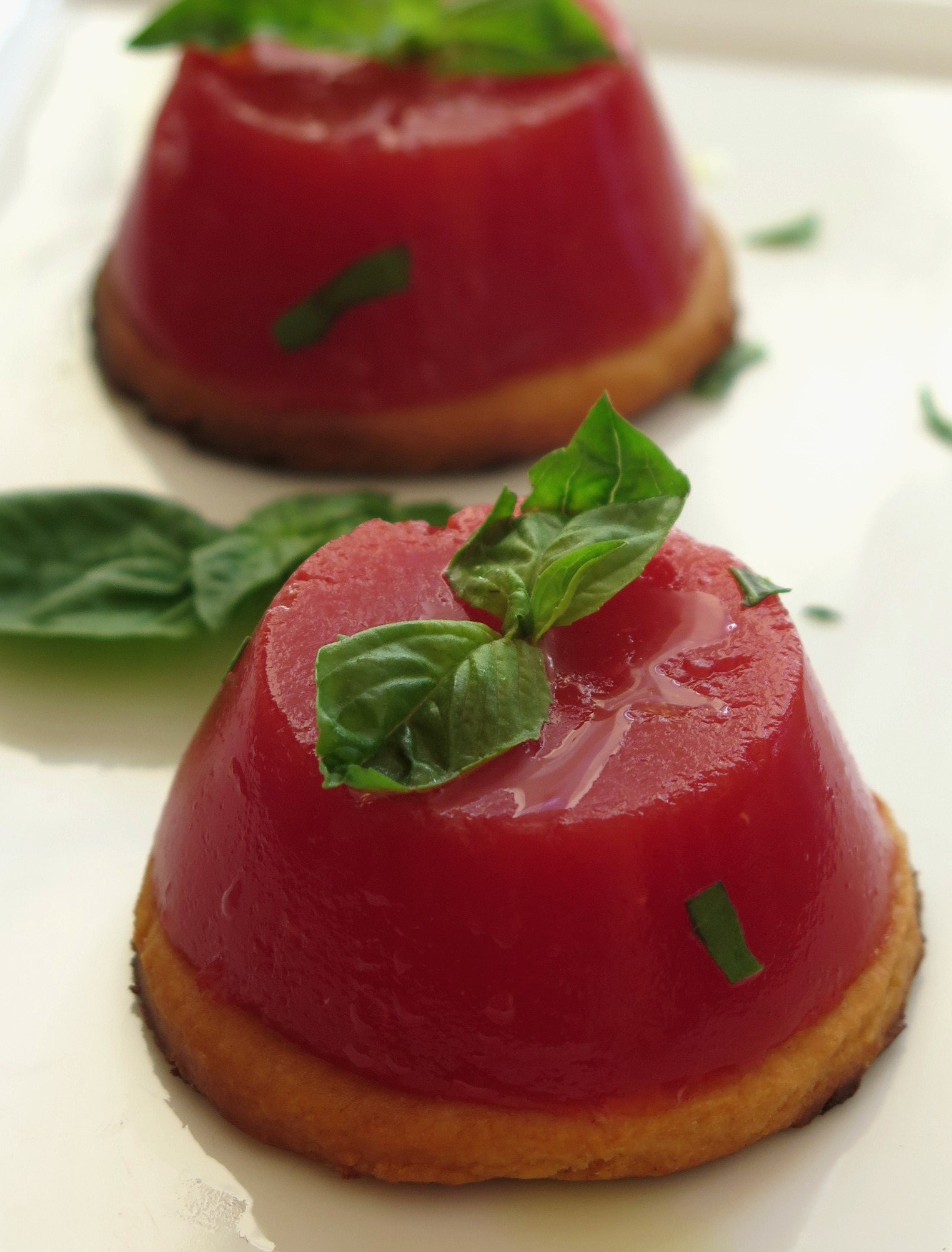 - Per comporre il piatto prendere il dischetto di frolla raffreddato. capovolgere dallo stampo la geleè, irrorare con olio e spolverare con foglie di basilico fresco