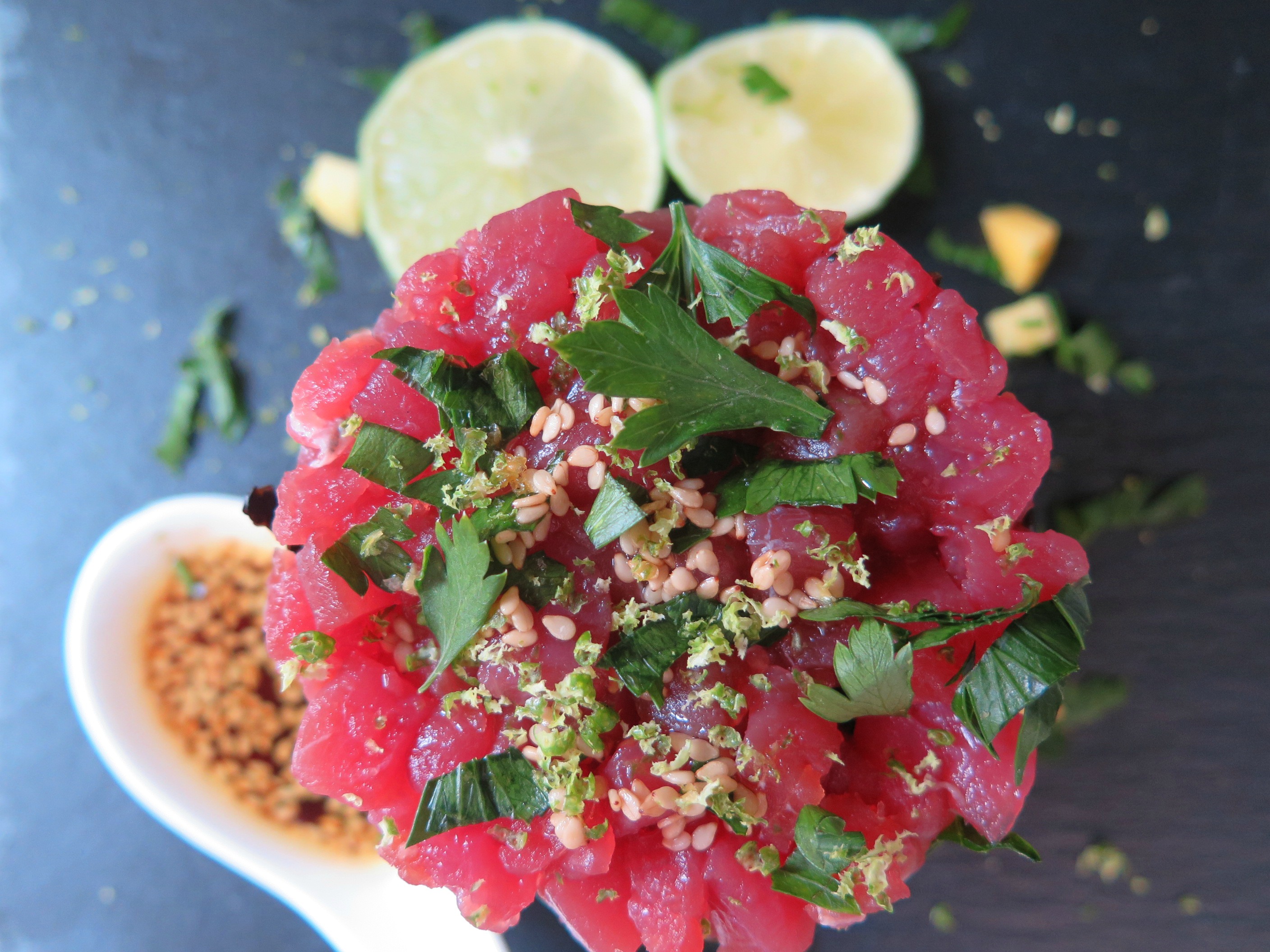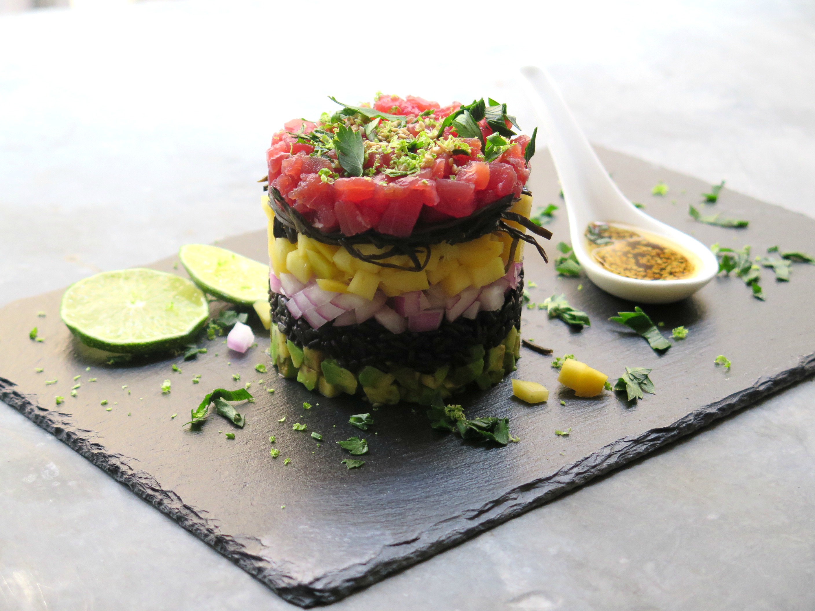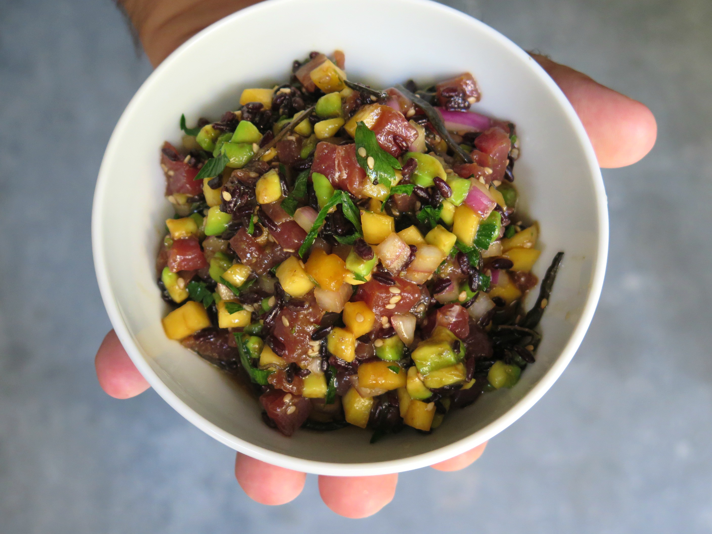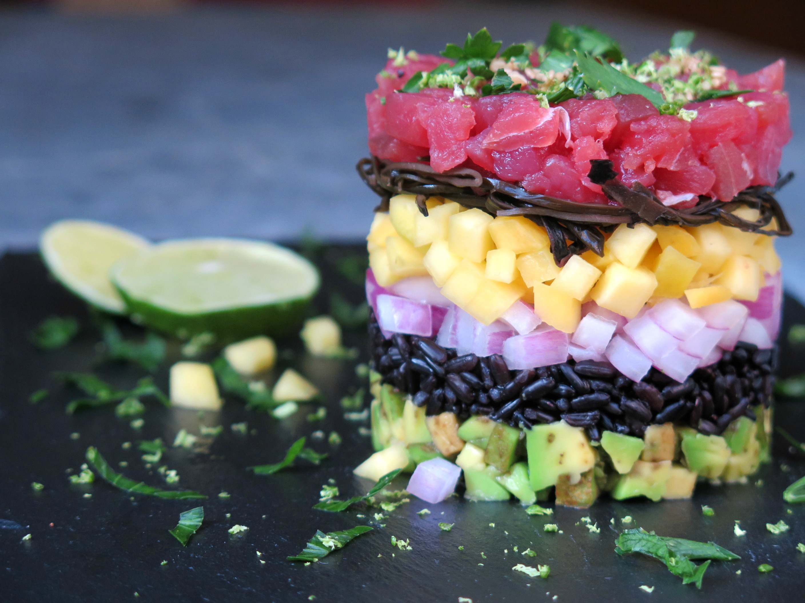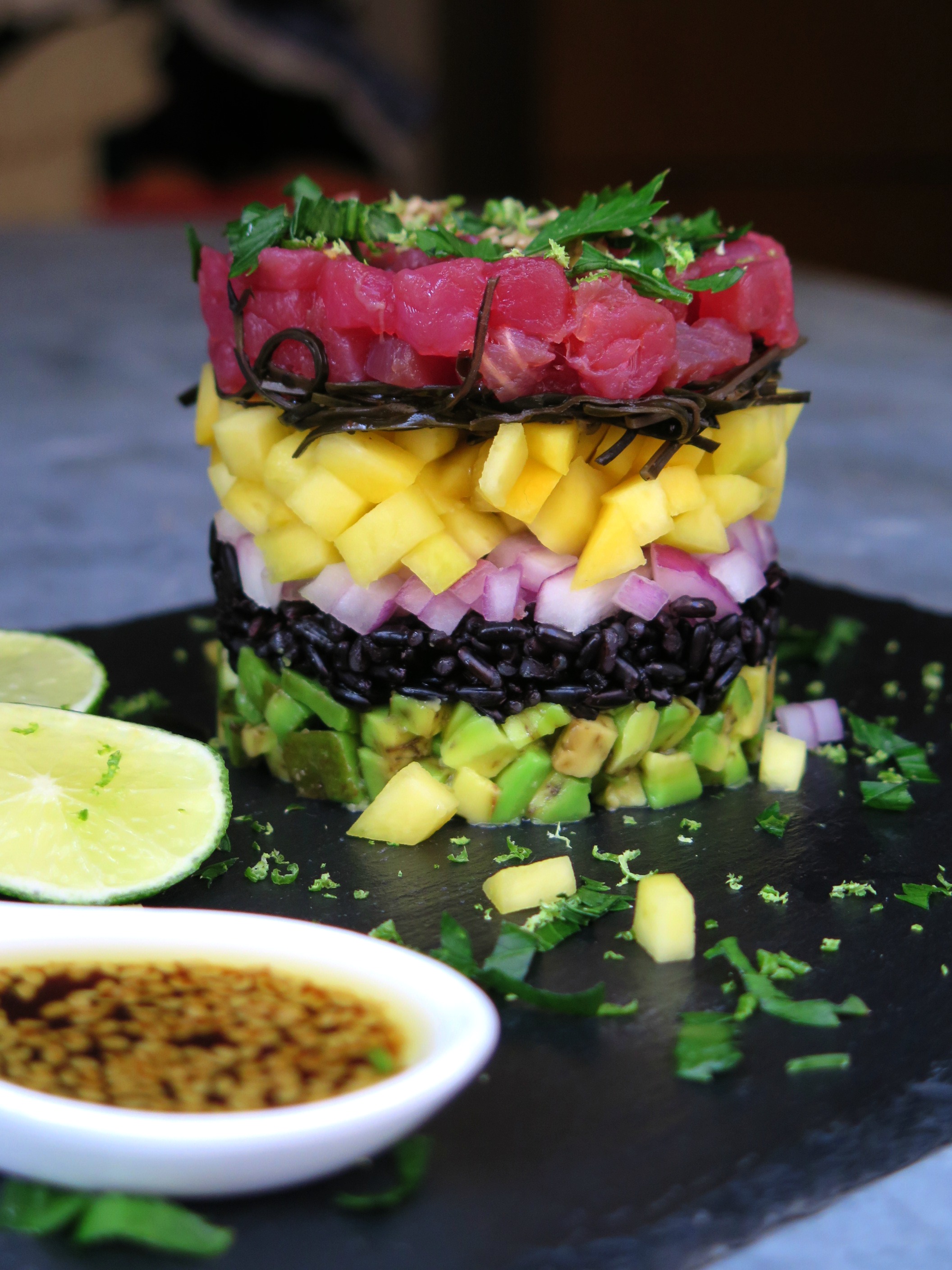 tartare di tonno con riso venere, frutta esotica e salsa al sesamo