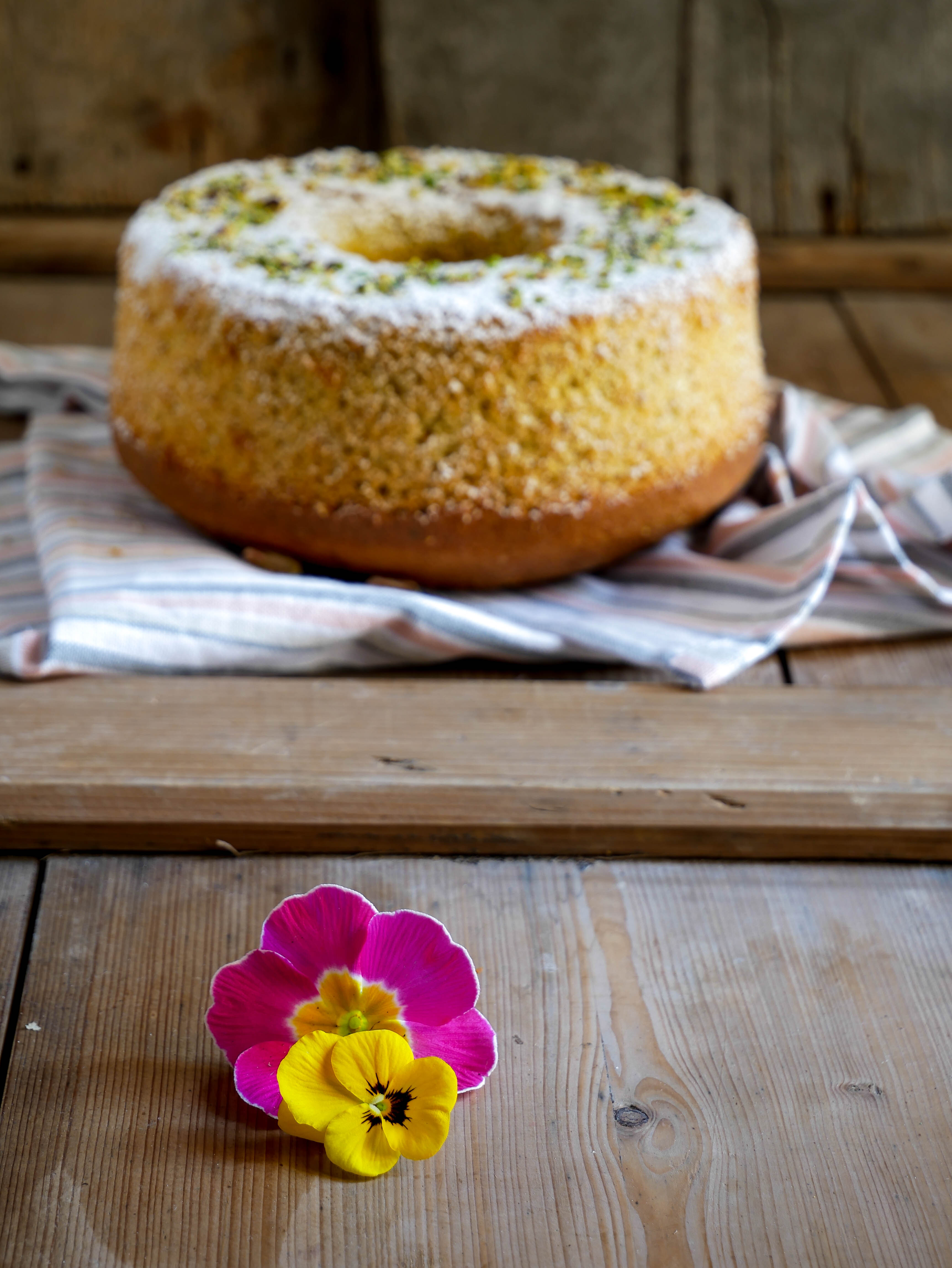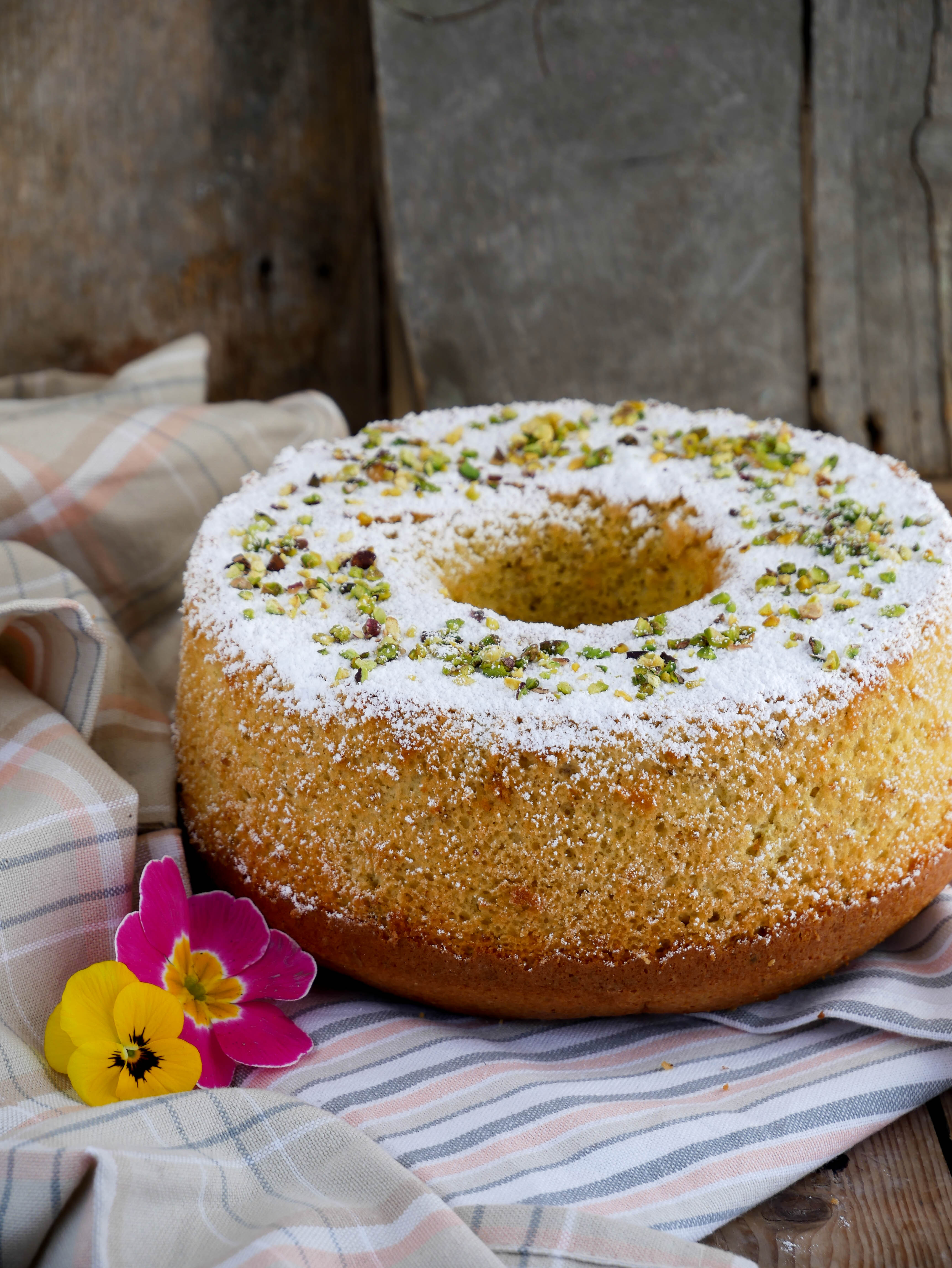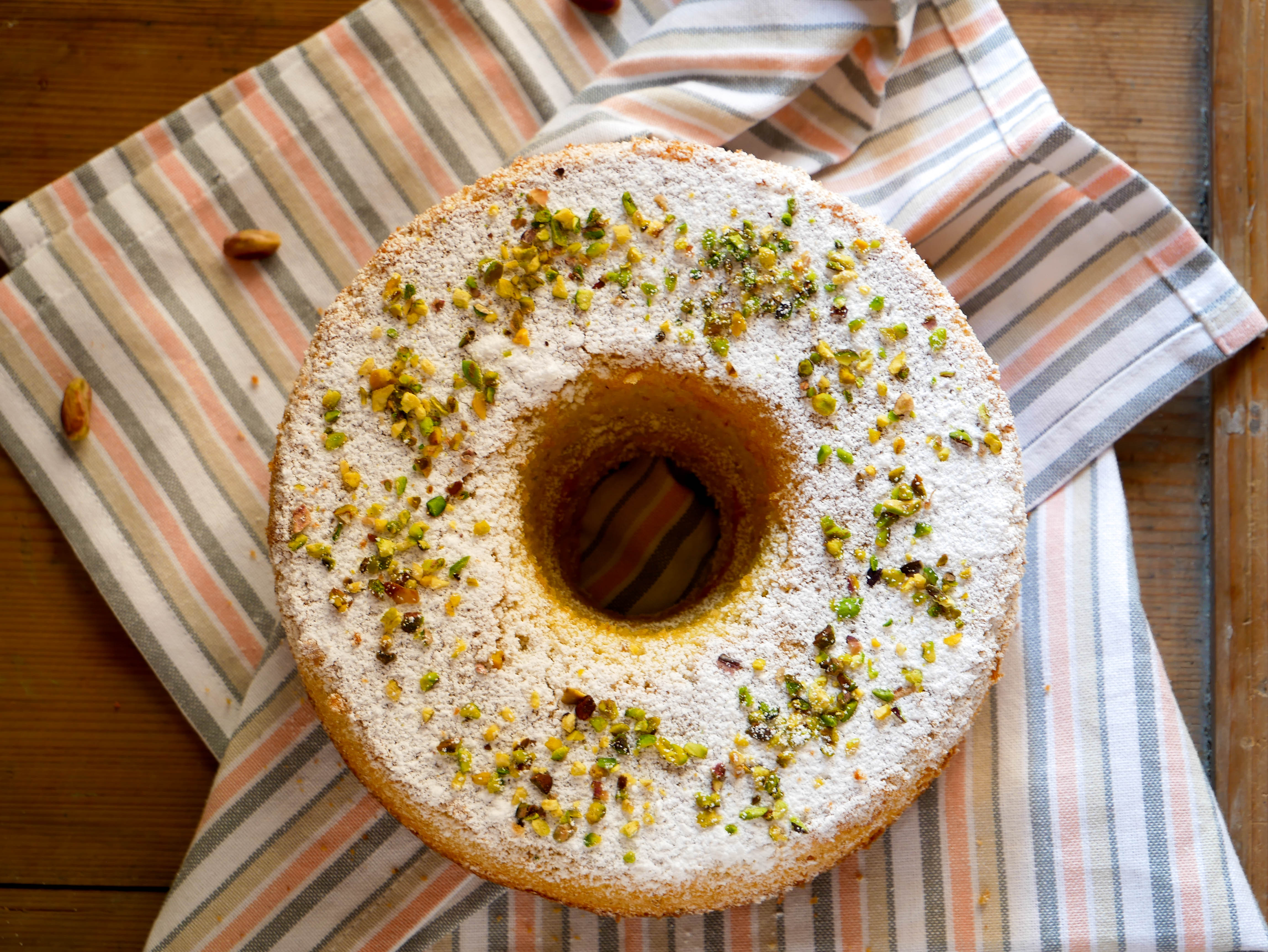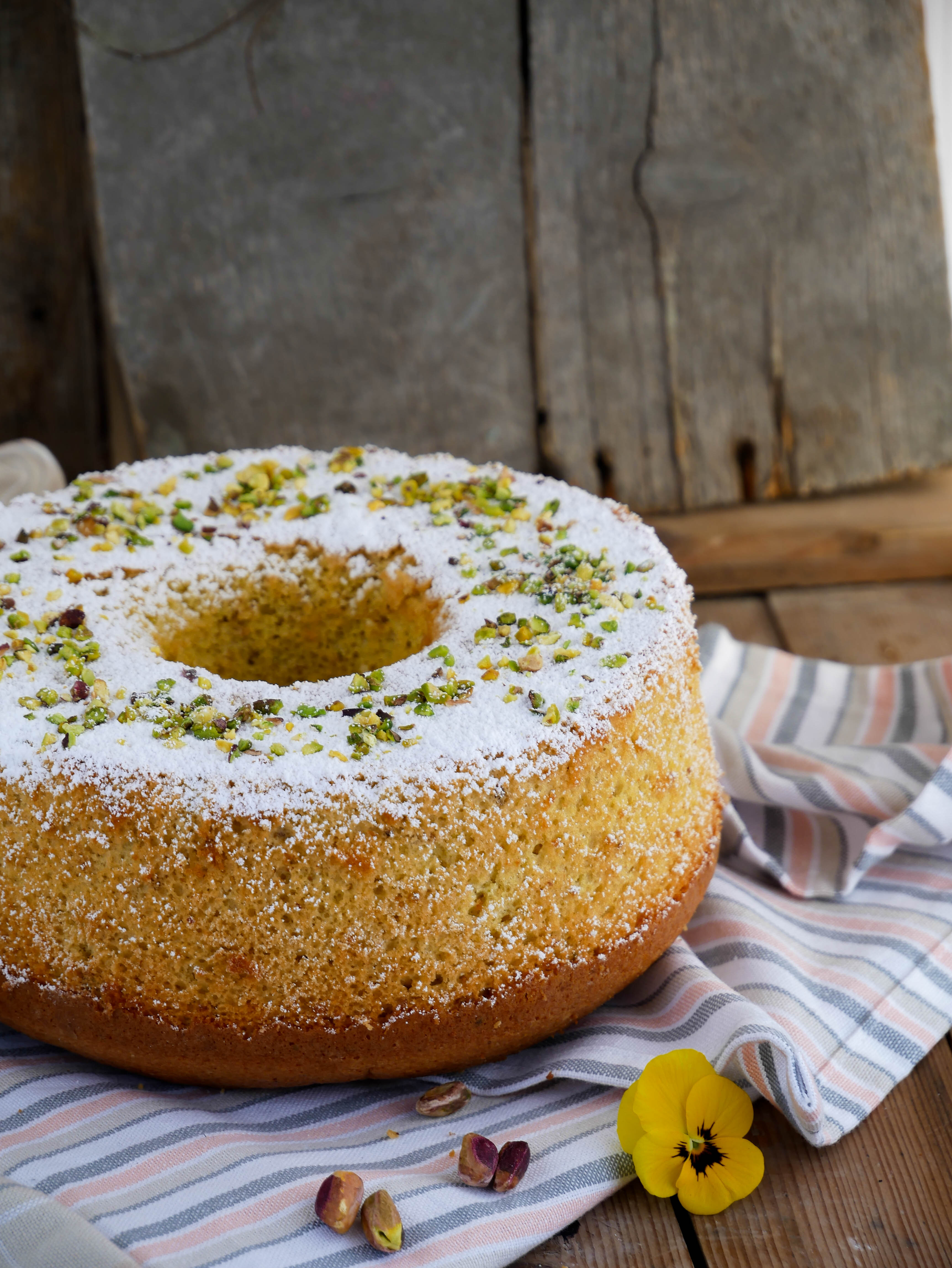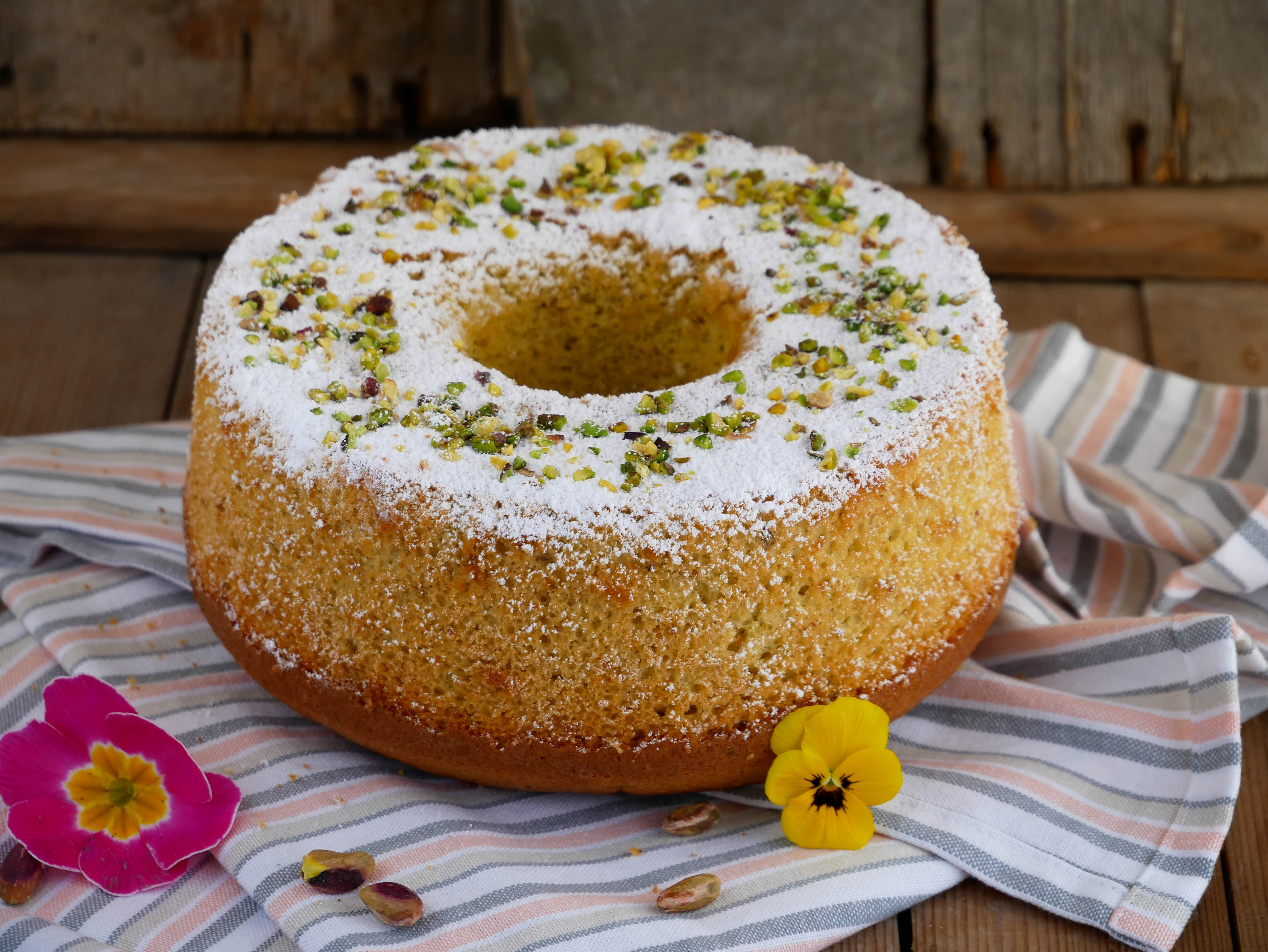 Capovolgere lo stampo appena sfornato fino a completo raffreddamento. Spolverare con zucchero al velo e granella di pistacchi.