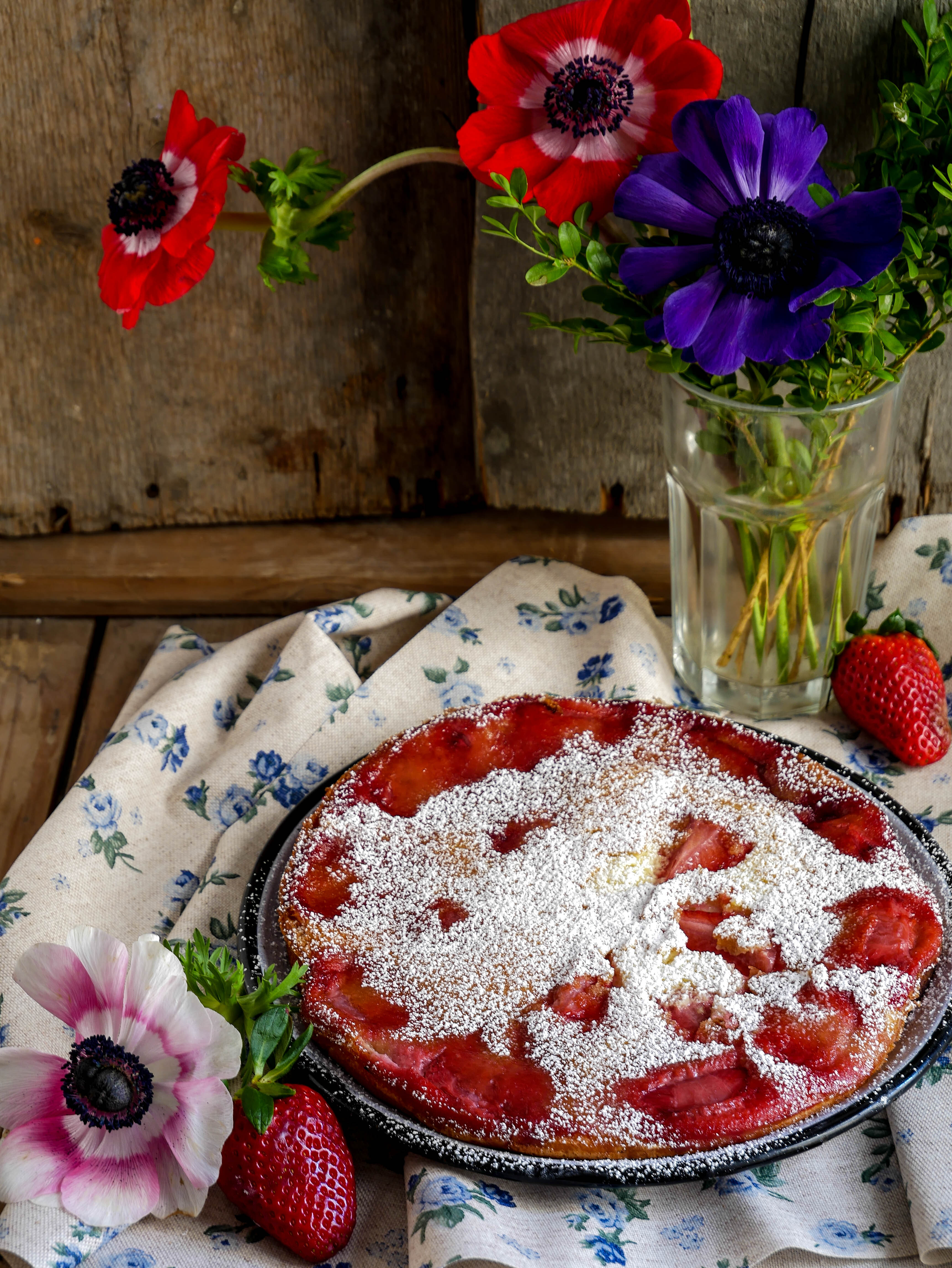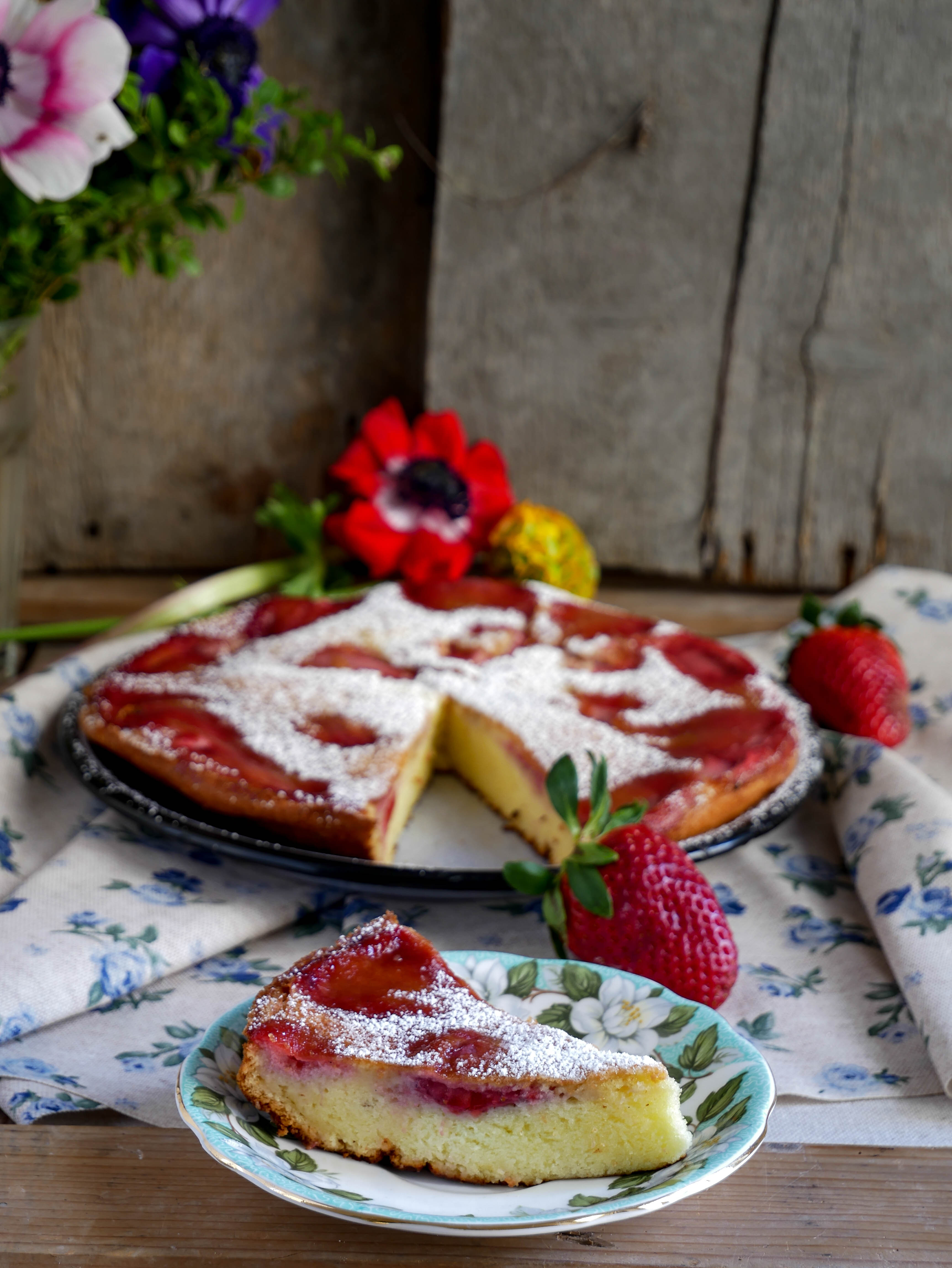 Dalle fragole di oggi è scaturita questa torta soffice che alla fine è una specie di torta rovesciata. A fine cottura le fragole scendono sul fondo, ben cotte, e così regalano un bellissimo colore rosso alla nostra torta. Finito con zucchero al velo e tanti colori!