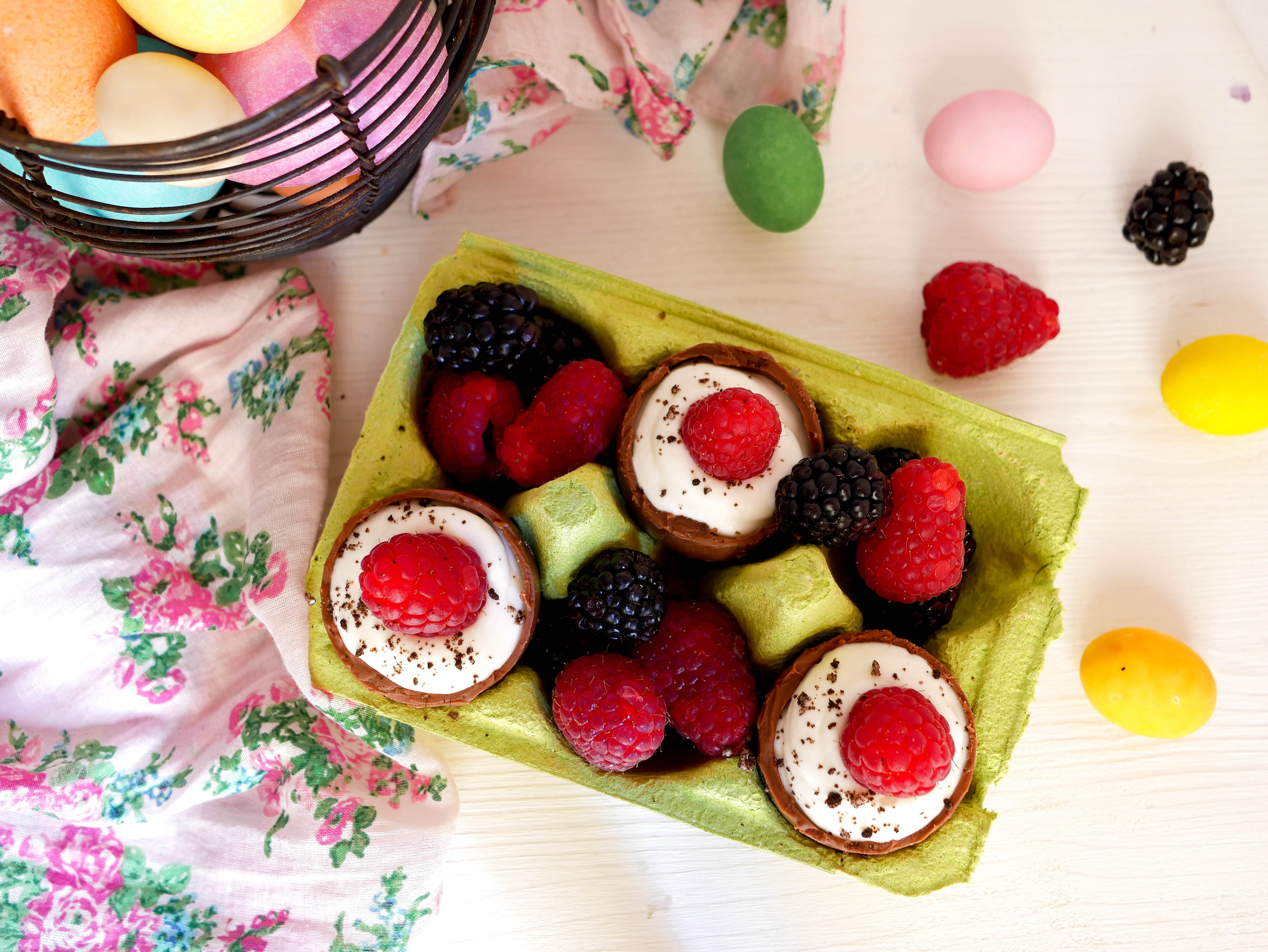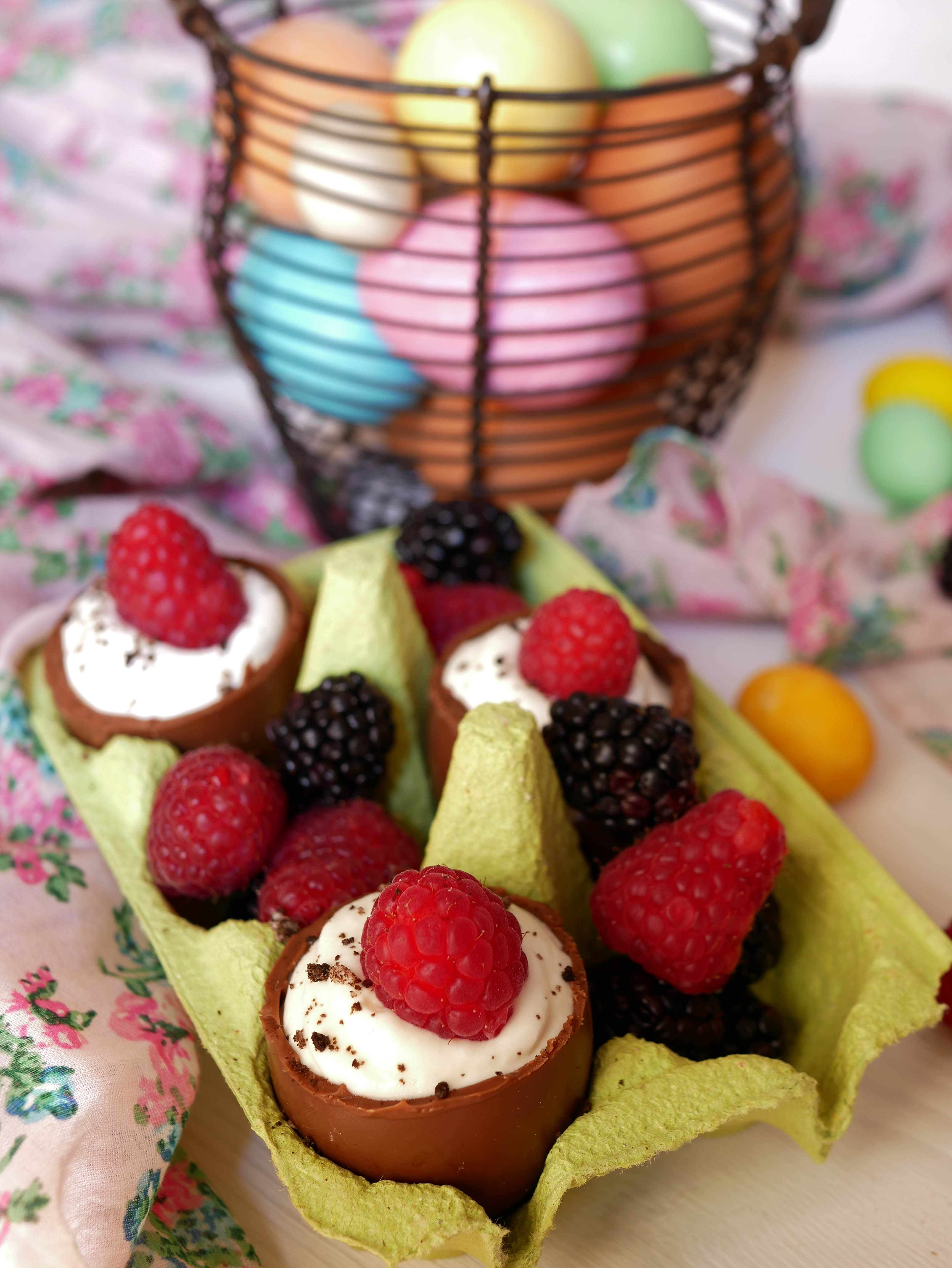 Con l’aiuto di un coltello eliminiamo la calotta degli ovetti. Aiutatevi scaldando leggermente la lama. In una ciotola montare la panna ma non del tutto. Unire il latte condensato e continuare a montare fino ad una consistenza cremosa e sostenuta. Riempire gli ovetti prima con i biscotti sbriciolati e poi con la crema. Finire con i frutti di bosco e una grattugiata di cioccolato.