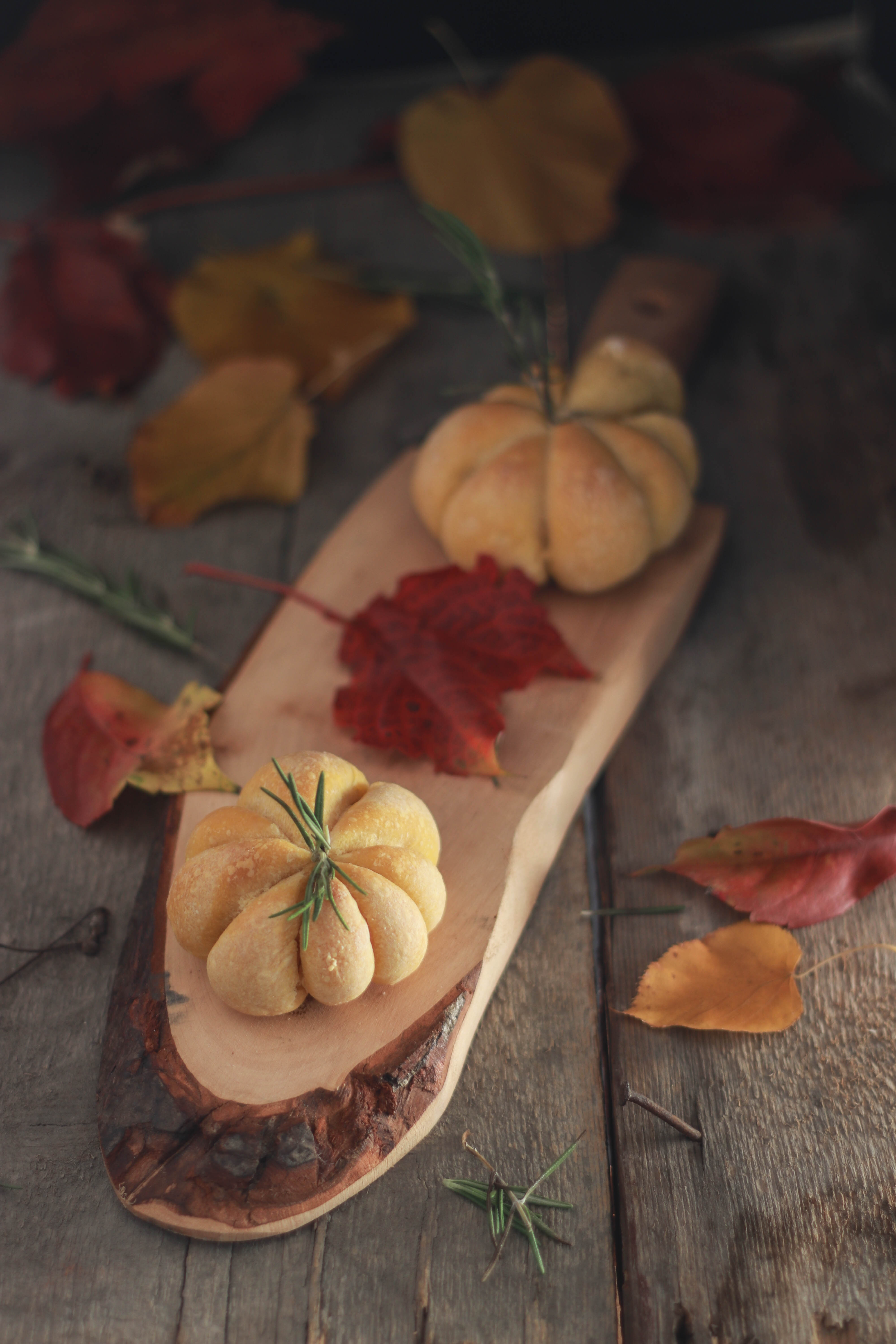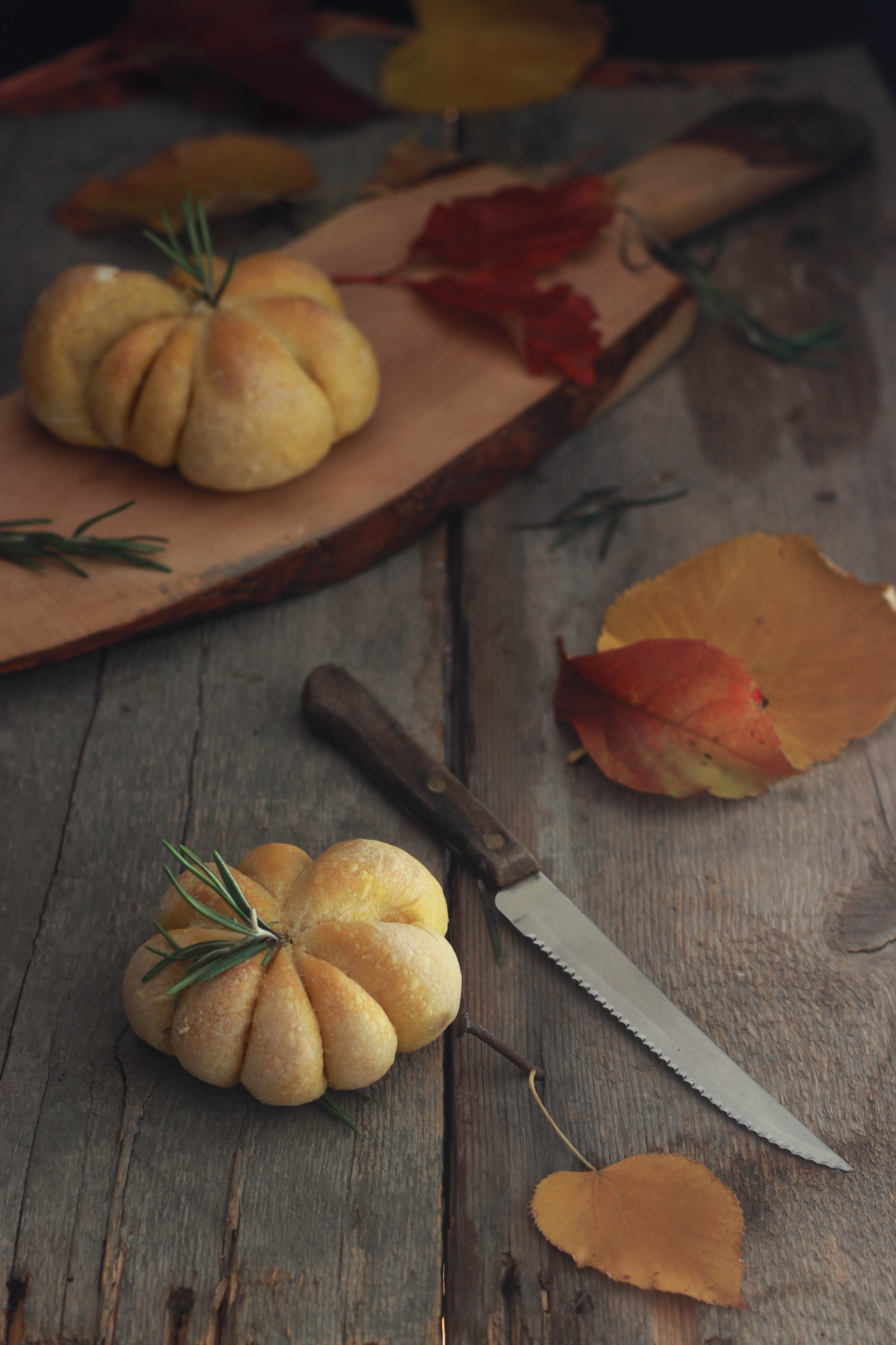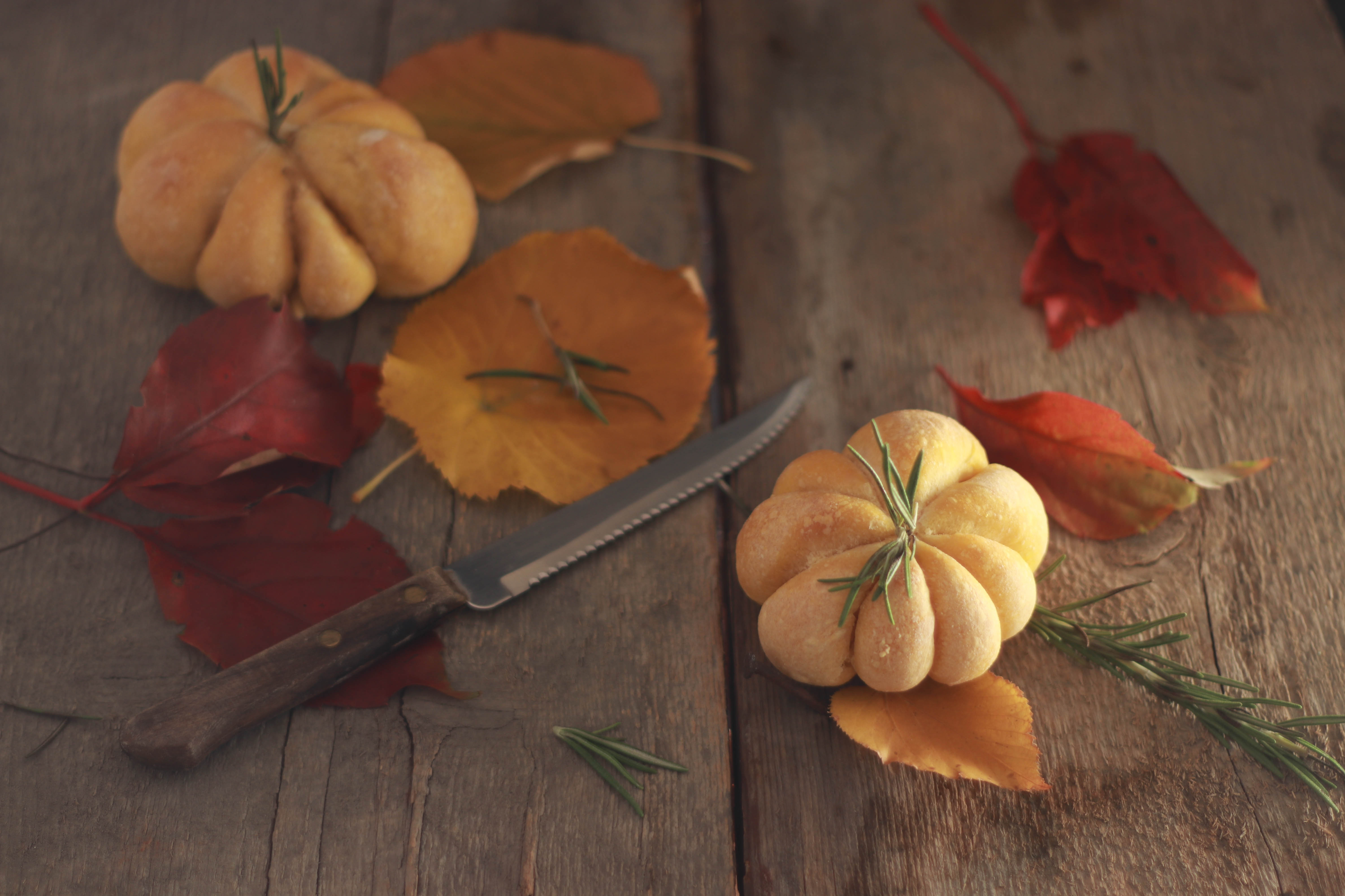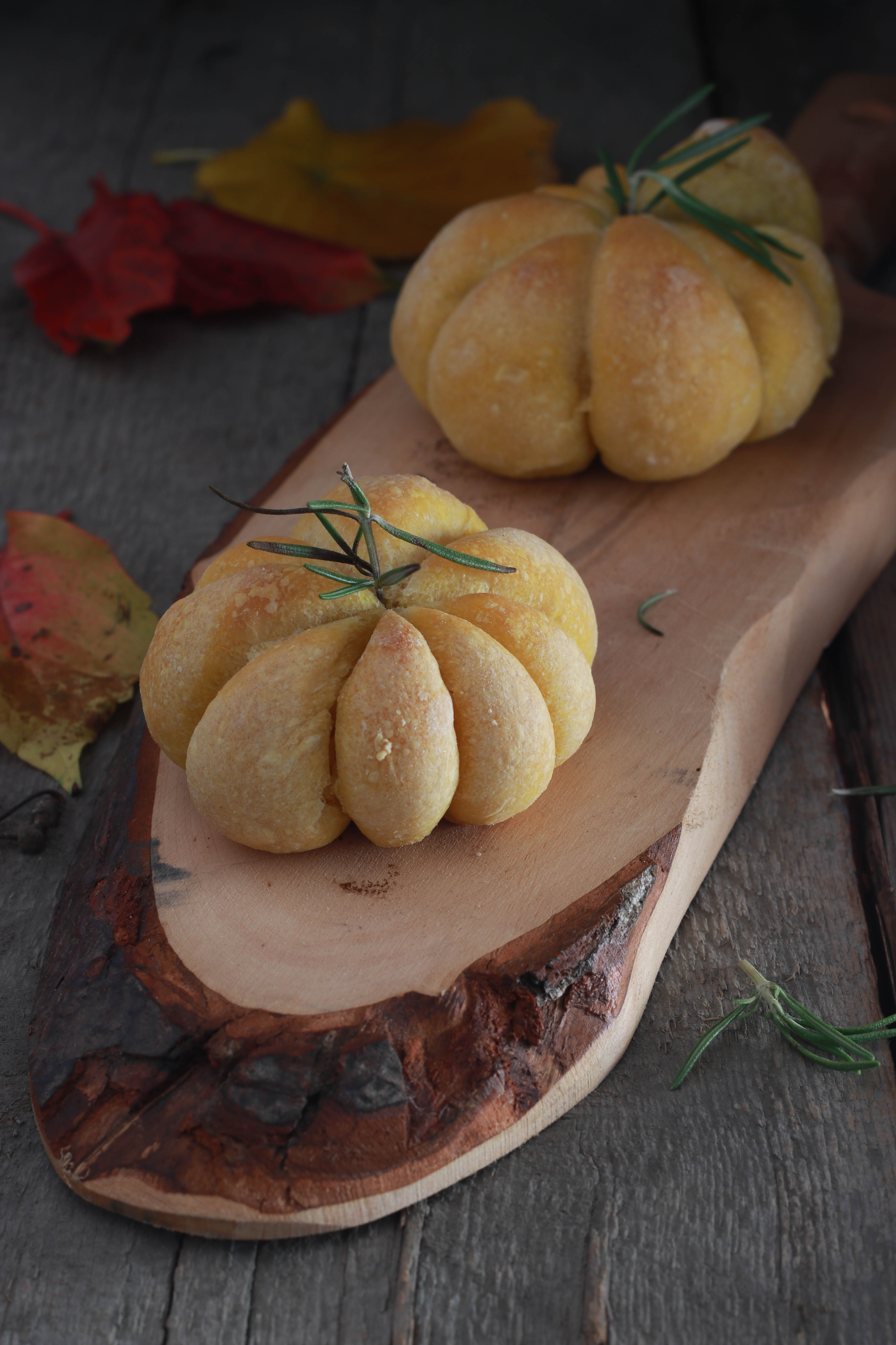 Nella ciotola della planetaria versare il lievito madre, il malto d’orso o il miele e la farina. Unire la purea di zucca, 50 g d’acqua e iniziare a lavorare il composto con il gancio (o con le mani) alla minima velocità. Aggiungete, quindi, il sale e la restante acqua (30 g). La quantità d’acqua potrebbe dipendere dal tipo di farina. Terminare aggiungendo l’olio ed impastate finché il composto non si staccherà dalle pareti della ciotola. Trasferitelo sul piano di lavoro infarinato e dategli un giro di pieghe e formate una palla. Mettetela in una ciotola unta d’olio e e copritela con la pellicola trasparente. Lasciate lievitare per due ore a temperatura ambiente, poi trasferitelo in frigorifero per tutta la notte. Il giorno dopo, togliete l’impasto dal frigo a lasciatelo riposare per un’oretta circa a temperatura ambiente, dopodiché trasferitelo sul tavolo da lavoro infarinato e formate le pagnotte: 2 da 500 g oppure 8 da 125 grammi, conferendo loro una bella forma tondeggiante e legare con lo spago a formare le zucche. Ungete d’olio il filo di spago da cucina. Dovrete ottenere otto spicchi, incrociando sempre lo spago e capovolgendo la pagnotta. Fate attenzione a non stringere troppo il filo perché con la lievitazione e la cottura il pane crescerà ulteriormente. Trasferite le pagnotte su una teglia rivestita di carta forno e lasciate lievitare fino al raddoppio. Infornate nel forno statico preriscaldato a 190° per 40 minuti circa per una pagnotta da 500 g e 30 minuti per le pagnotte piccole. Lasciate raffreddare, dopodiché tagliate lo spago aiutandovi con della forbici e inserite un rametto di rosmarino al centro per completare le zucche. E’ possibile anche formare una normale pagnotta o filone come siete abituati a fare normalmente.