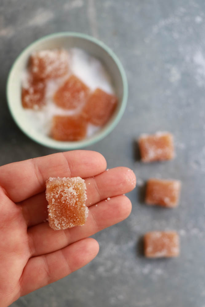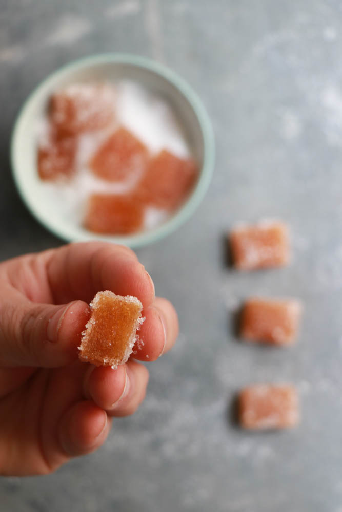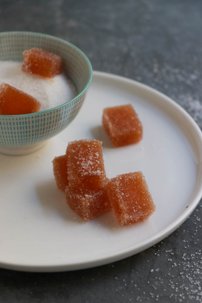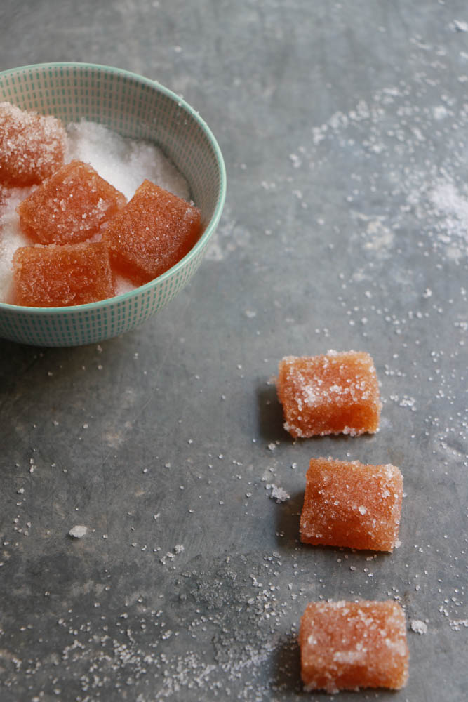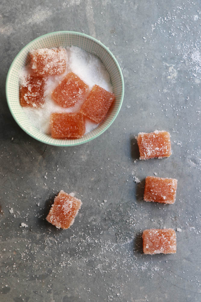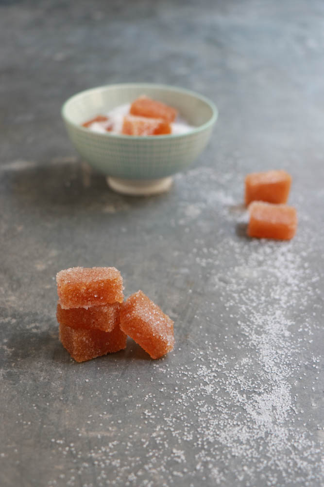 Estrarre il succo dai kaki, se altro frutto potete frullare e passare al colino. Mettere il succo sul fuoco con lo zucchero e con la gelatina precedentemente lasciata a bagno in acqua fredda per 10 minuti. Sciogliere il tutto, lasciar raffreddare leggermente e versare negli stampini. Io ho usato degli stampi rettangolari piccoli che poi ho “affettato”. LAsciare in frigo per 2/3 ore ma anche di più. Passare nello zucchero e incartare. Non preparatele troppo in anticipo che lo zucchero tenderà a sciogliersi.