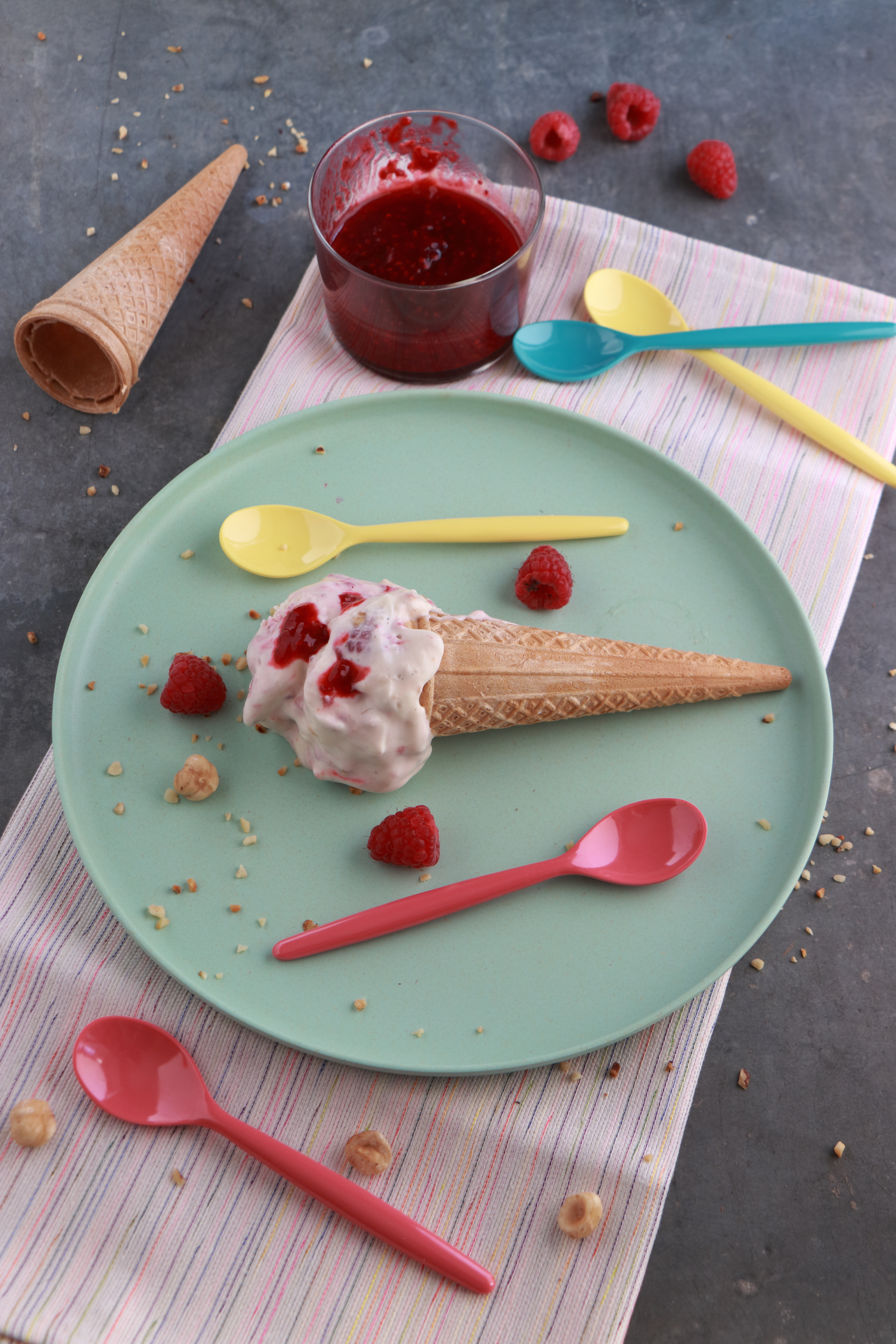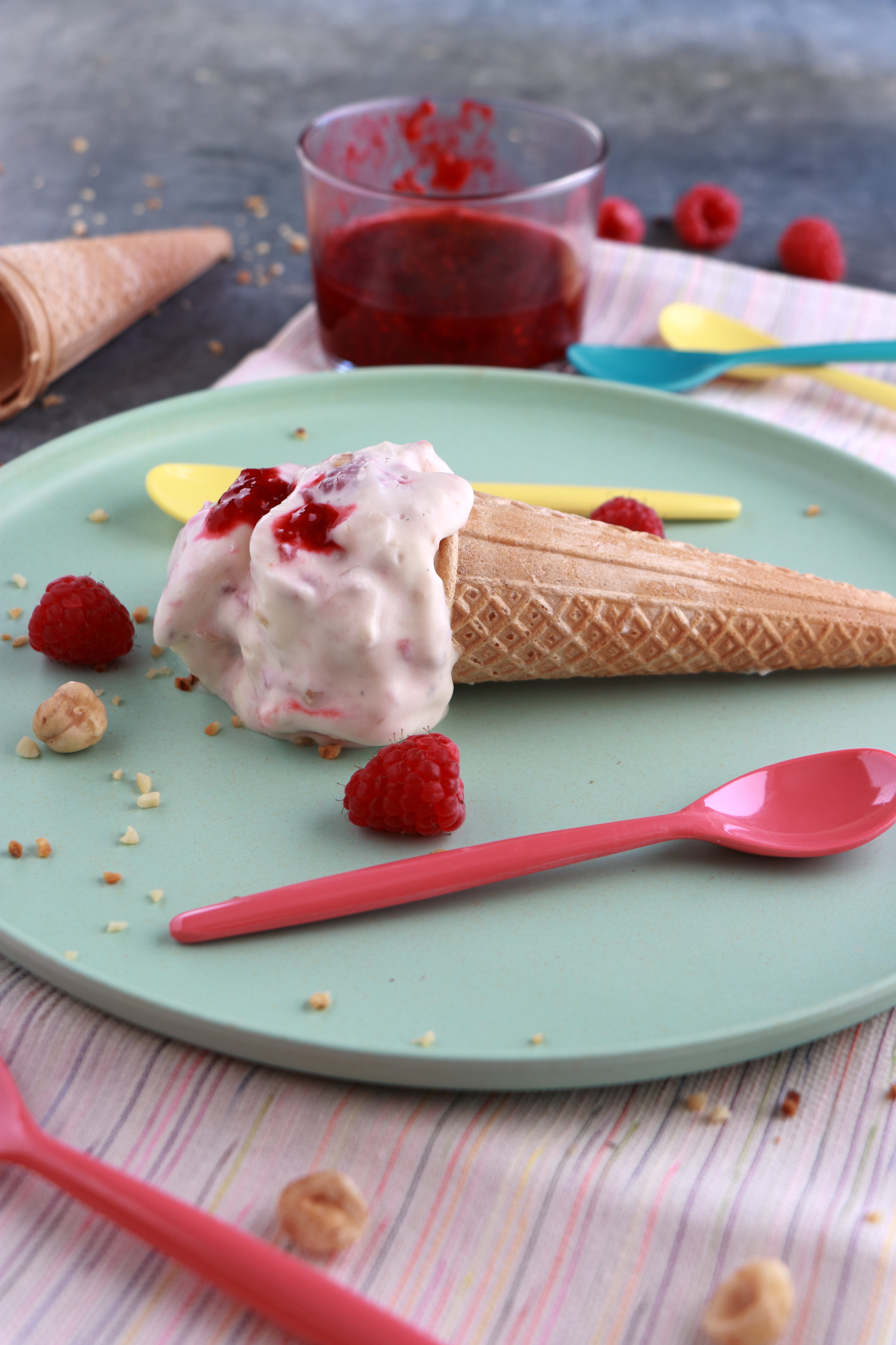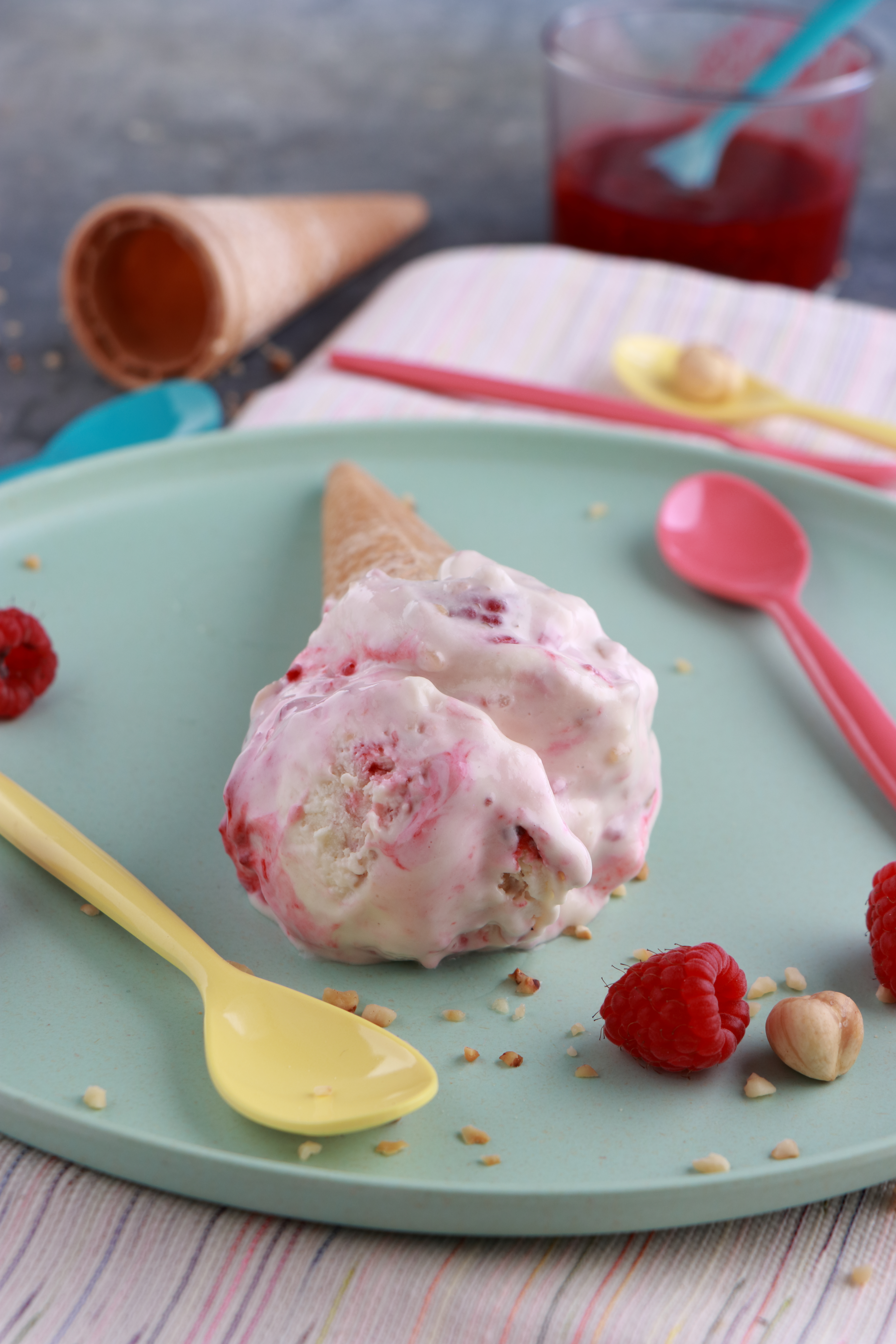 Infondo al post trovate la ricetta originale scelta dalle mitiche Alessandra, Alice e Giulia! Io ho usato le nocciole al posto del pistacchio solo perchè non avevo più i pistacchi che sono in assoluto la mia frutta secca preferita! Ma vedrò di replicare con i pistacchi! Il gelato mascarpone e lamponi senza gelatiera è possibile prepararlo anche in monodose dentro degli stampini, noi a casa abbiamo preferito il tipico cono!
