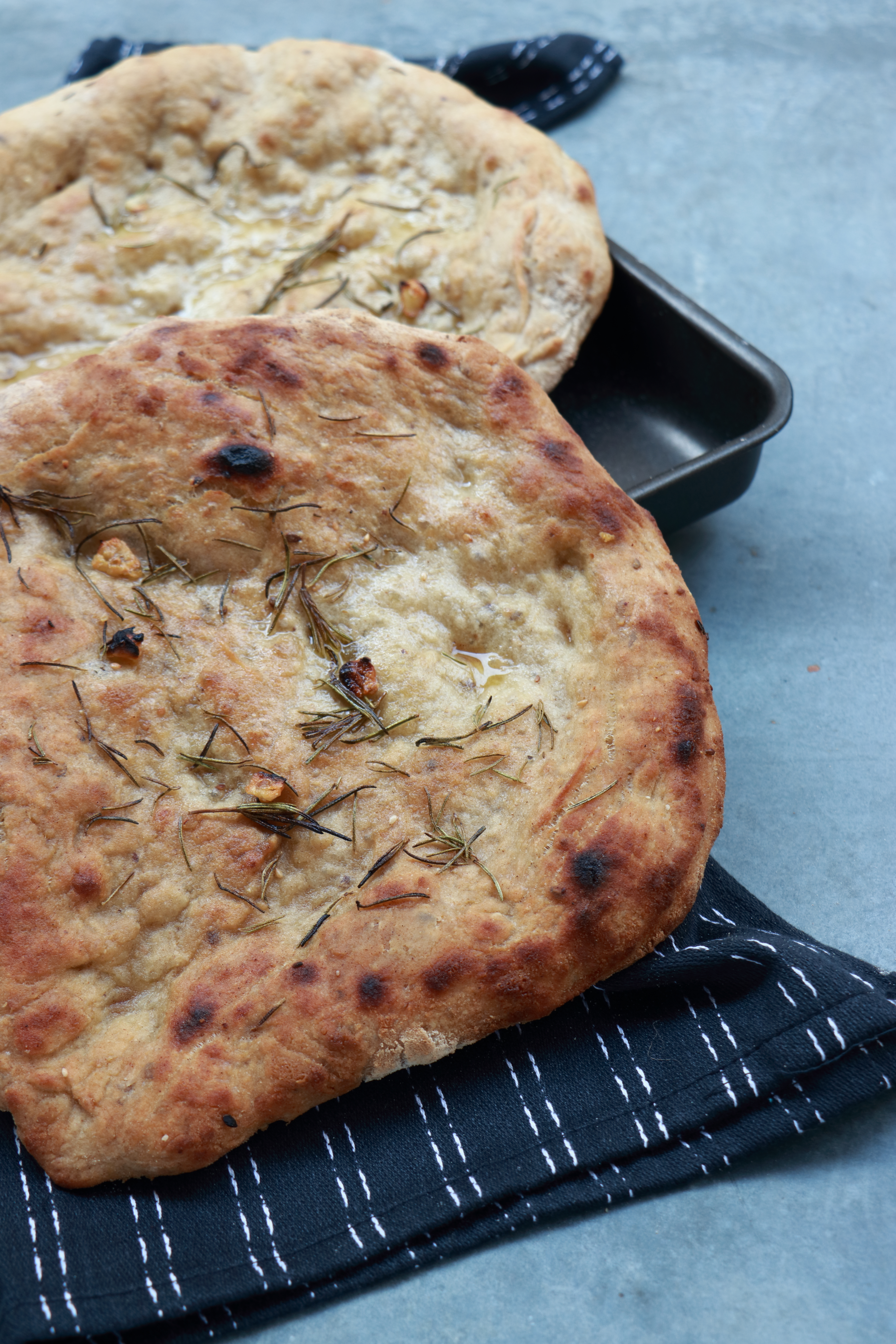 - Allargare le focacce, spennellare con olio, rosmarino, aglio e sale grosso.