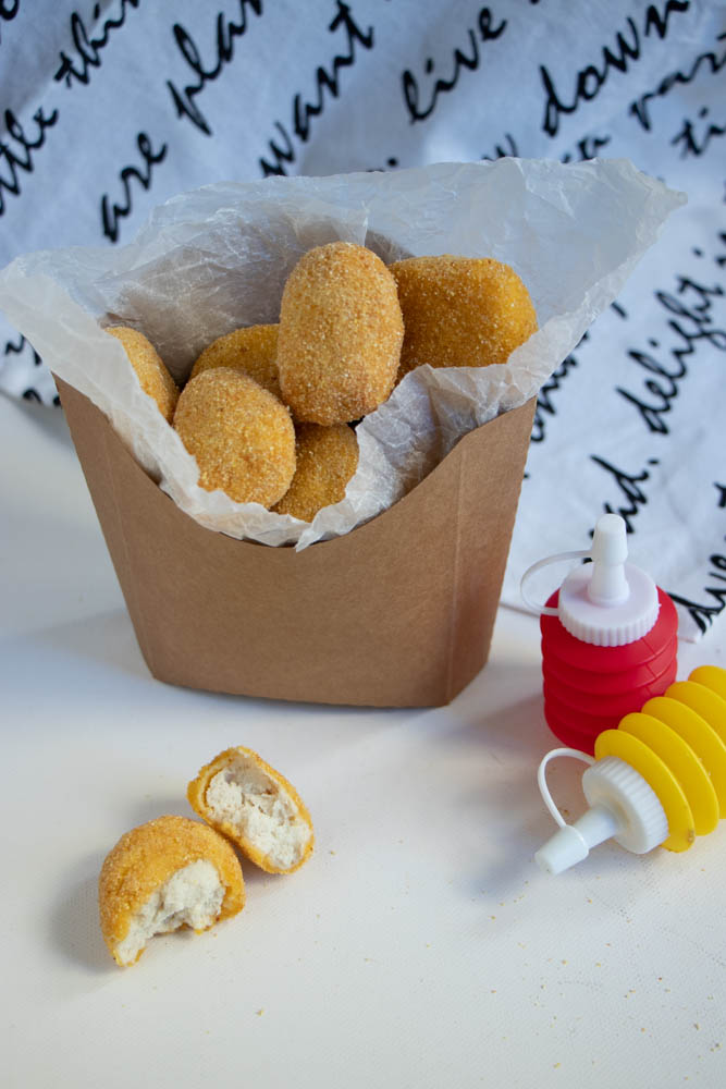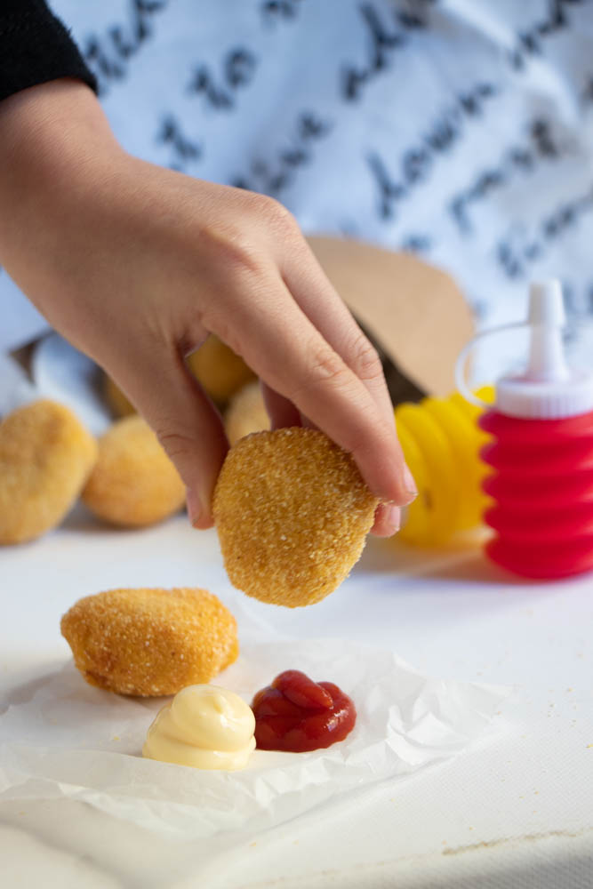 - Passate i vostri nuggets nella panatura, poi nella pastella e poi di nuovo nella panatura.