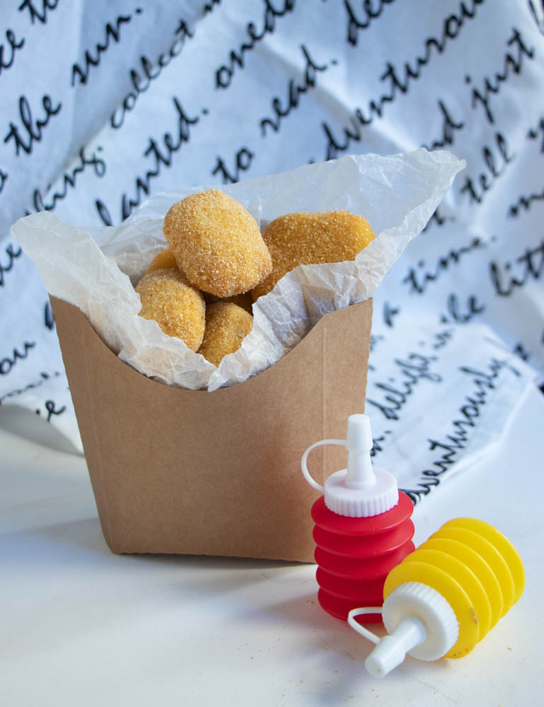- Per la frittura, riscaldate abbondante olio di semi di mais in un pentolino dai bordi alti, portate a 170°/ 175° e friggete poco per volta.