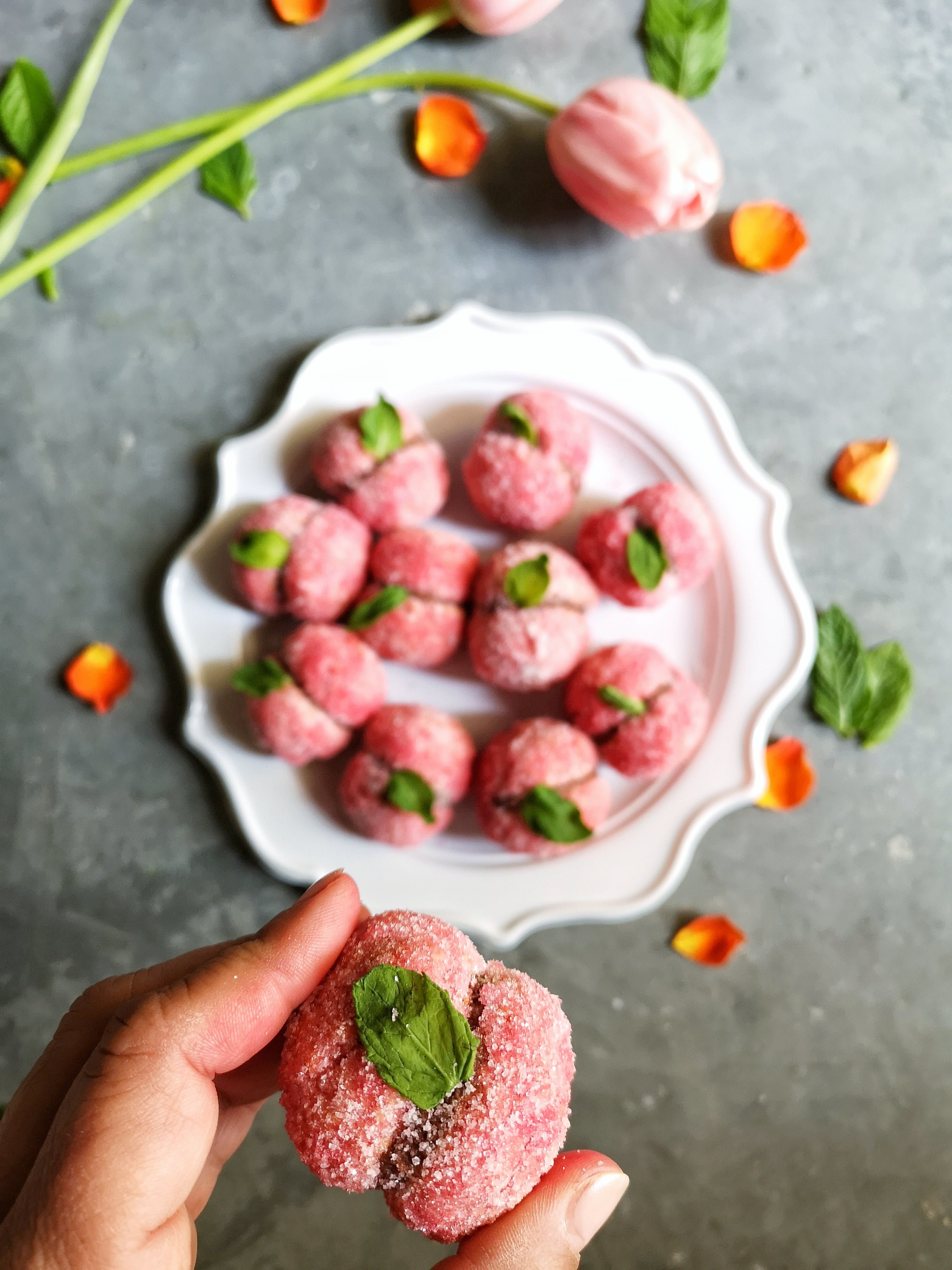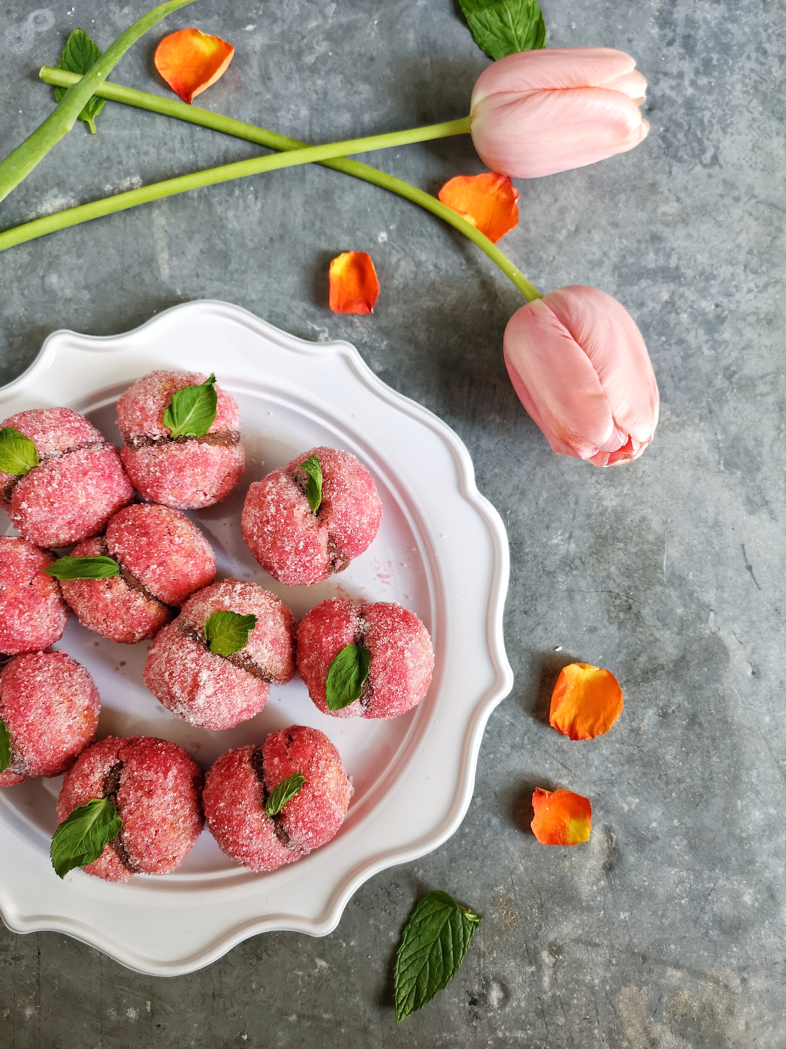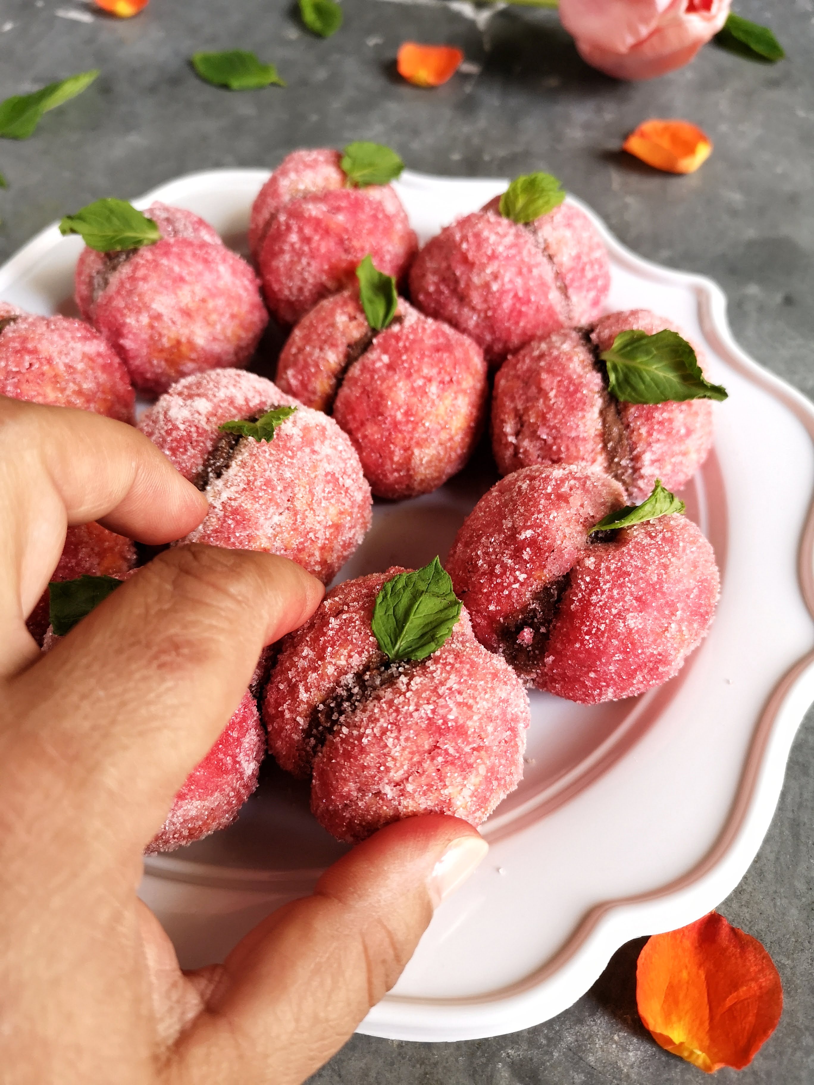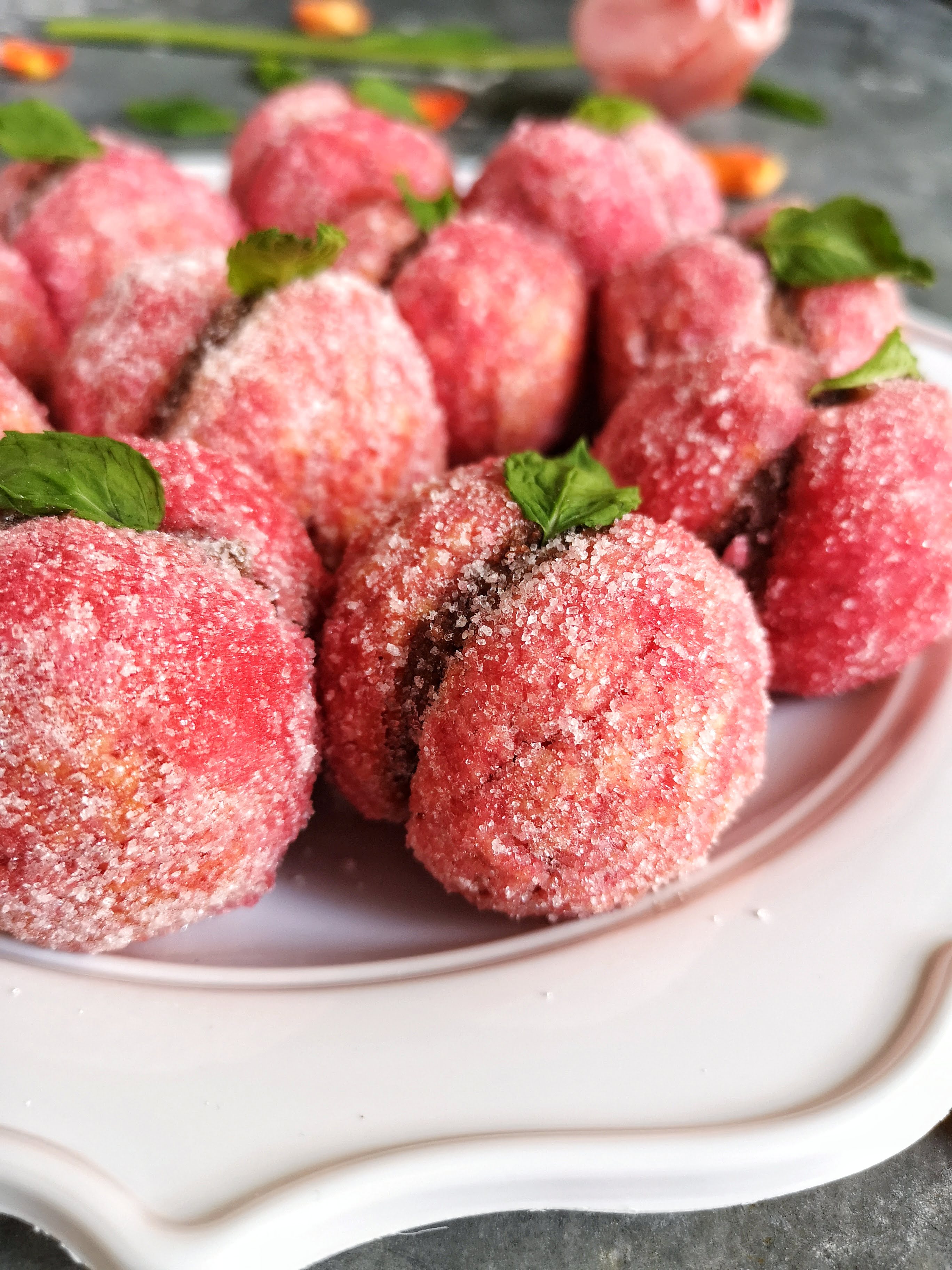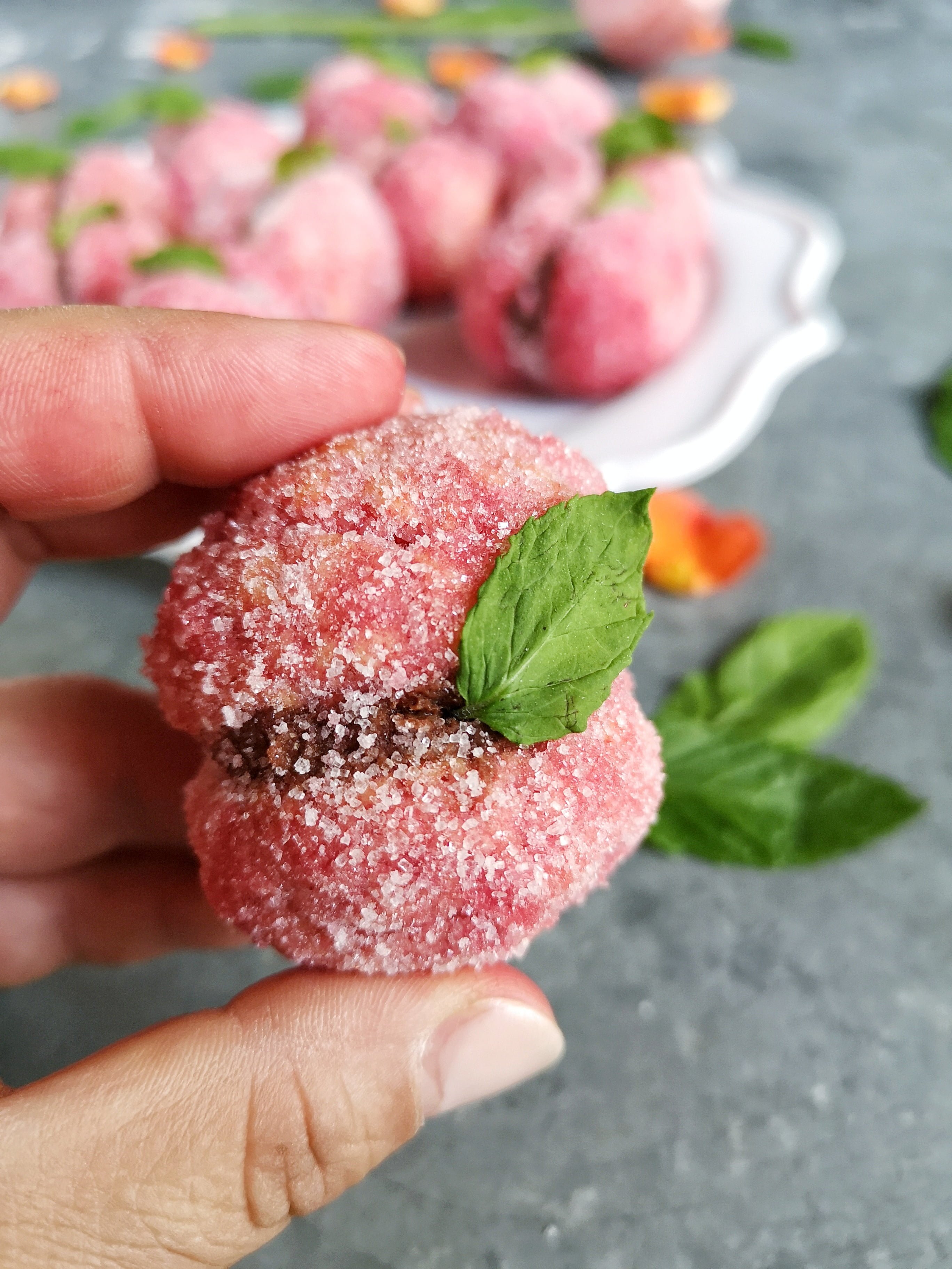 - Passare la peschetta in un piatto dove avrete messo metà alchermes e metà acqua, non lasciarle troppo in ammollo, far scolare bene e poi passarle nello zucchero semolato.