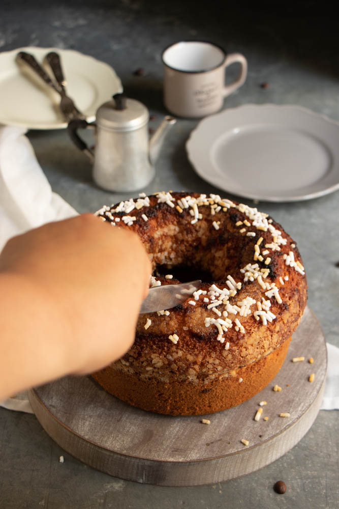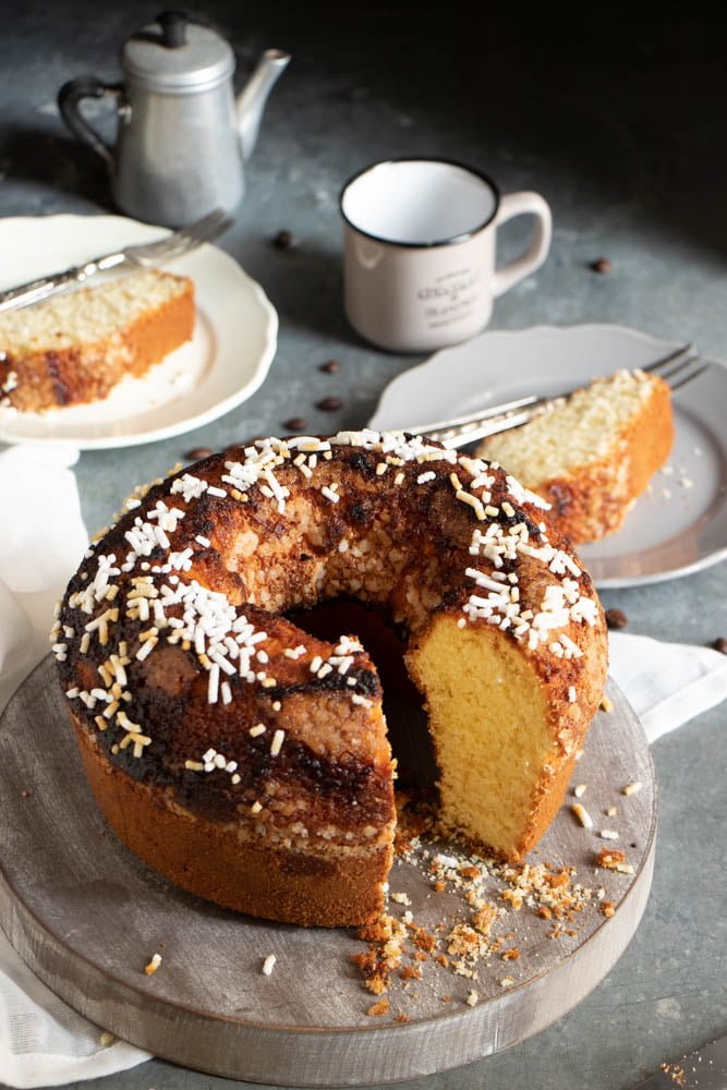 Questa ricetta è storica anche per me perché i miei ricordi di infanzia sono legati alle estati passate dai mie nonni in campagna. Tutti i lavori che si svolgevano nel periodo estivo erano per noi bambini una festa e così tutte le usanze e le preparazioni che si facevano. A metà mattina mia nonna portava ai lavoratori questo ciambellone con del vino rosso. Una tradizione che ormai, con l’andare del tempo e l’aumento della tecnologia in campagna è venuta meno ma il dolce resta sulle nostre tavole per la colazione.