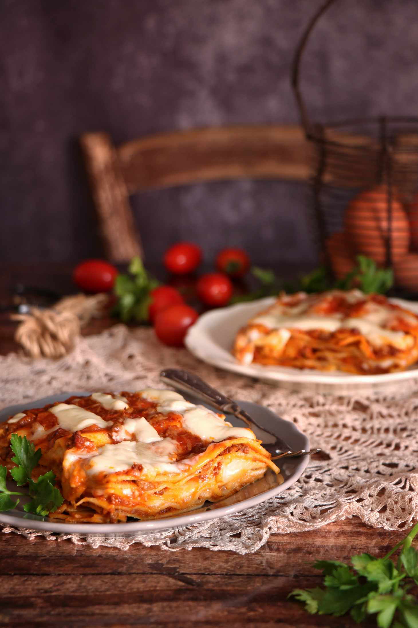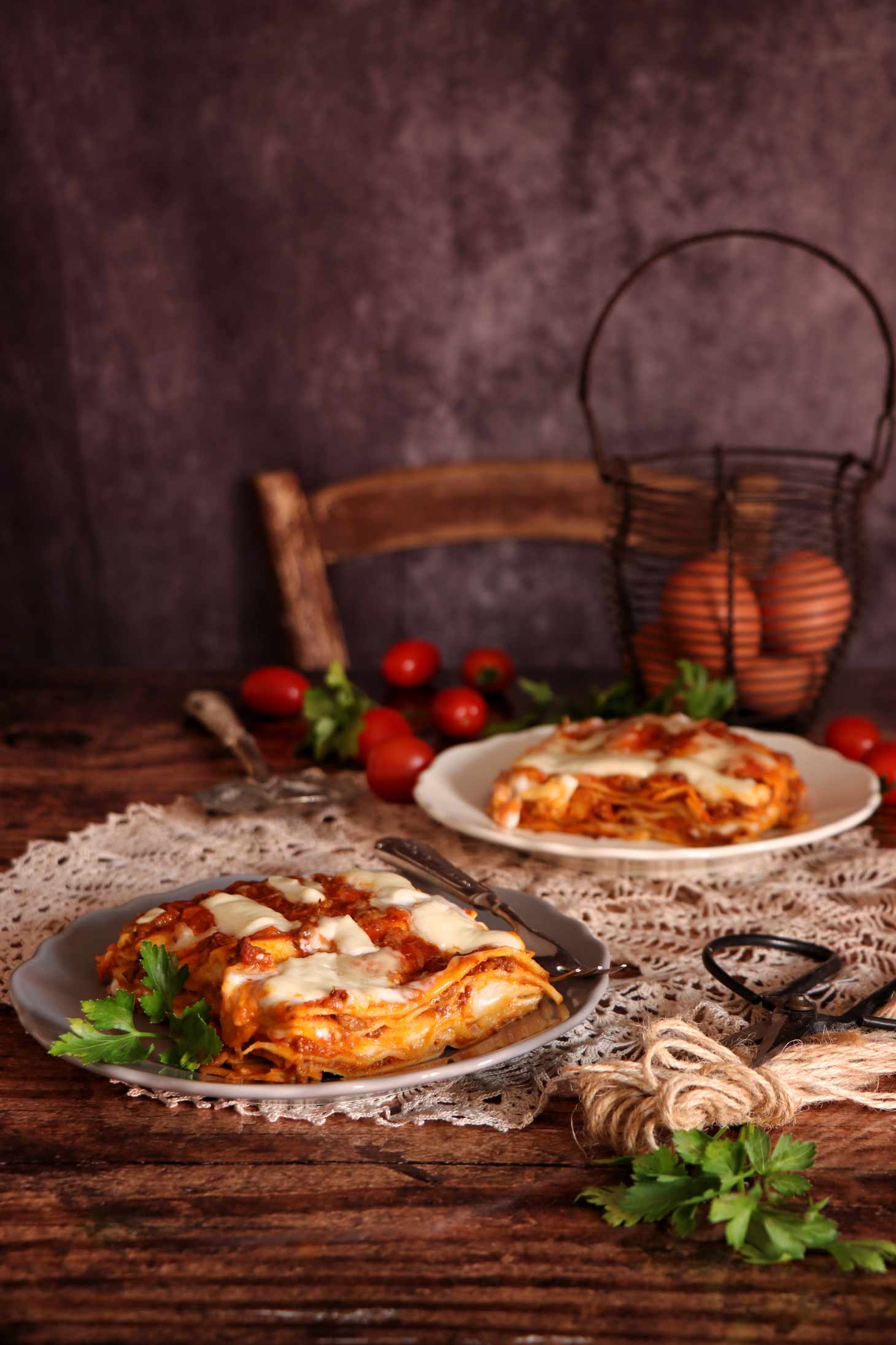 Sfoglia, pomodoro, mozzarella, parmigiano e besciamella e chiudere con un nuovo strato di sfoglia .