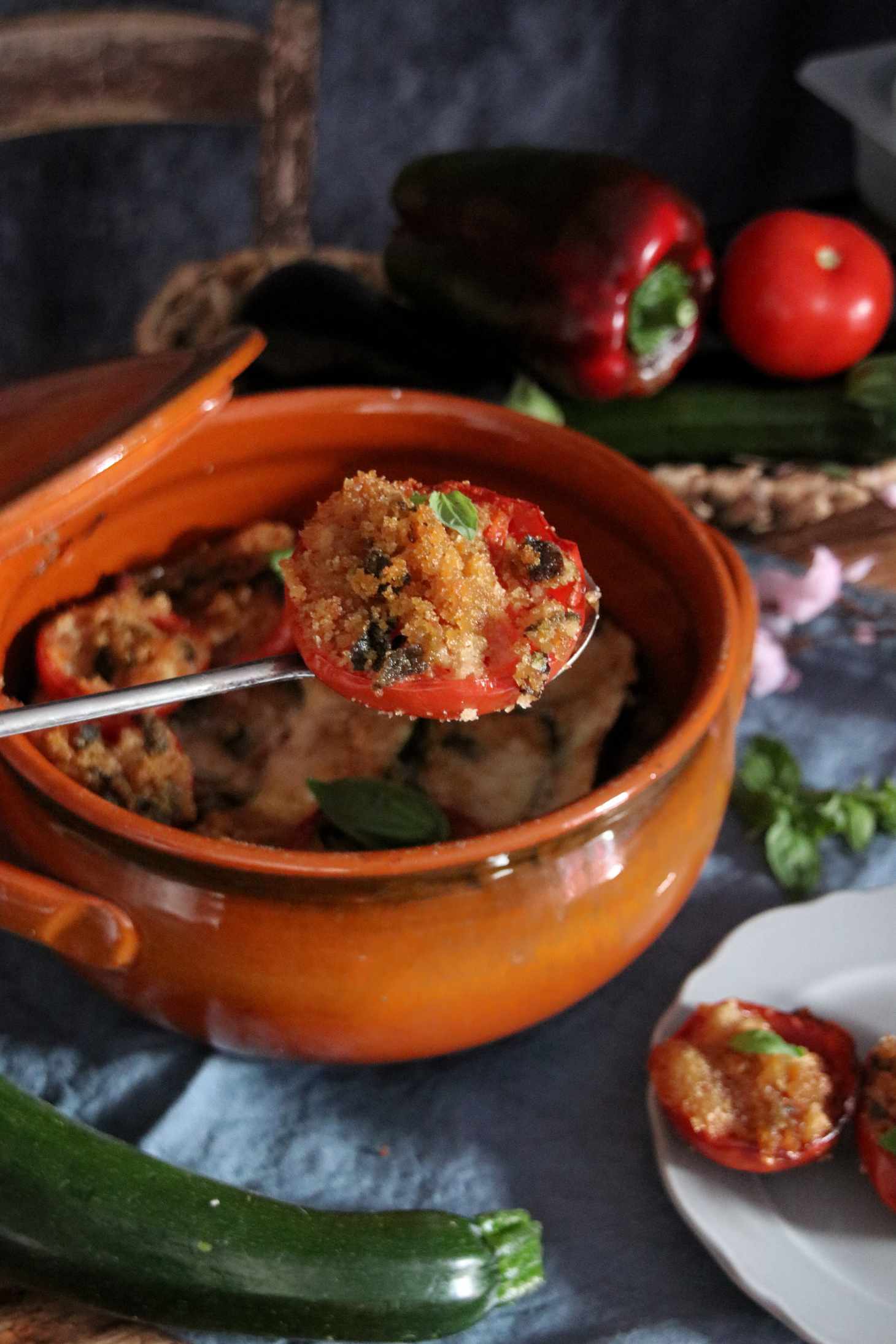 Adagiare infine le verdure in una teglia di coccio a più strati, terminando con i pomodori.